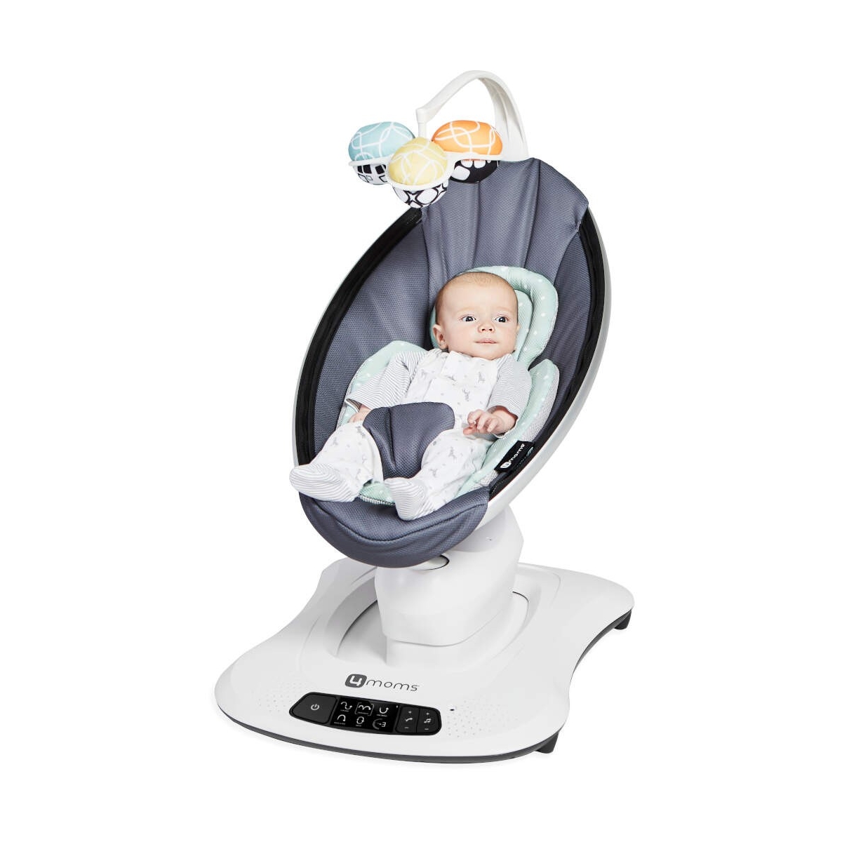 The mama Roo moves just like you do. The mama Roo 4 sways from side to side and bounces up and down just like parents do when comforting their baby. Five unique motions will soothe your baby such as car ride and tree swing with five different speeds. The bouncer also has four built-in sounds or can easily be connected to any MP3 player. Suitable from birth to 9kg or until baby can sit up unaided, the seats reclines to multiple positions to allow baby to lie back and relax or sit up and play. Bluetooth enables parent to control motion, sound, speed and volume from your smart device without even having to disturb baby. The overhead toy mobile includes interactive, reversible toy balls. Keep baby’s attention with the sound of the crinkle ball, rattler or reflective mirror ball. FEATURES: From birth up to 9kg (or until baby can sit up unassisted) 5 unique motions (car ride, kangaroo, tree swing, rock-a-bye, wave) 5 speeds Liner sold separately 4 built in sounds MP3 plug-in Bluetooth enabled Adjustable seat recline including lie flat Overhead toy mobile with interactive, reversible toys Easy to remove, machine washable seat 3-point harness Sleek base and design shape Detects obstructions AC Adaptor (no batteries required) 2 year guarantee DIMENSIONS: 84 x 50 x 65 Weight 8. 6kg