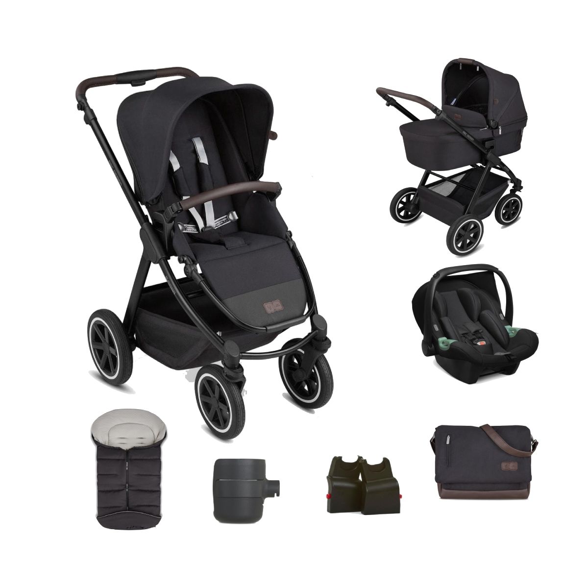 PACKAGE INCLUDES: ABC Design Samba Fashion Edition Stroller ABC Design Samba Fashion Edition Carrycot ABC Design Tulip Group 0+ Car Seat ABC Design Car Seat Adapter for Tulip ABC Design Urban Diaper Bag Fashion Edition ABC Design Winter Footmuff ABC Design Samba Raincover ABC Design Cup Holder ABC DESIGN SAMBA FASHION EDITION 2IN1 PRAM SYSTEM Whether in the city, the park or off the beaten track – your new Samba all-terrain pushchair can cope with any surface. Large, puncture proof air chamber wheels, high-quality ball bearings and the integrated suspension offers maximum comfort and ensures a smooth ride for your baby. Thanks to the practical swivel wheels, you can steer the agile combi pushchair easily around any obstacle. This makes even narrow shopping aisles or maneuvering around passers-by in the city bustle a child’s play. If you are not using the pushchair, it can be folded up very easily & quickly. The small folding size makes it fit into even the smallest car boot. The standalone function offers you maximum comfort, meaning that the Samba pram stands on its own. So you don’t even have to bend down to pick it up. The train is about to leave! Now it’s time to hurry. The nice thing about the Samba is: you can fold it up quickly, even with the seat unit attached. So you can take the combi pushchair with you on the bus or train without taking up too much space. The practical transport lock offers safety and prevents the pram from unfolding unintentionally. The new memory function of the carrycot holders offers you extra ease of use. With one click you can unlock one after the other and always have one hand available to hold the carry handle of the carrycot. This makes it even easier and safer to remove the carrycot from the frame of your pushchair. Tip: You can fold the carrycot to save space and store it even more easily in the boot. FEATURES: Usable from birth up to 22 kg Suitable for city and country Compact folded size Folds with the seat Light weight, 12. 9