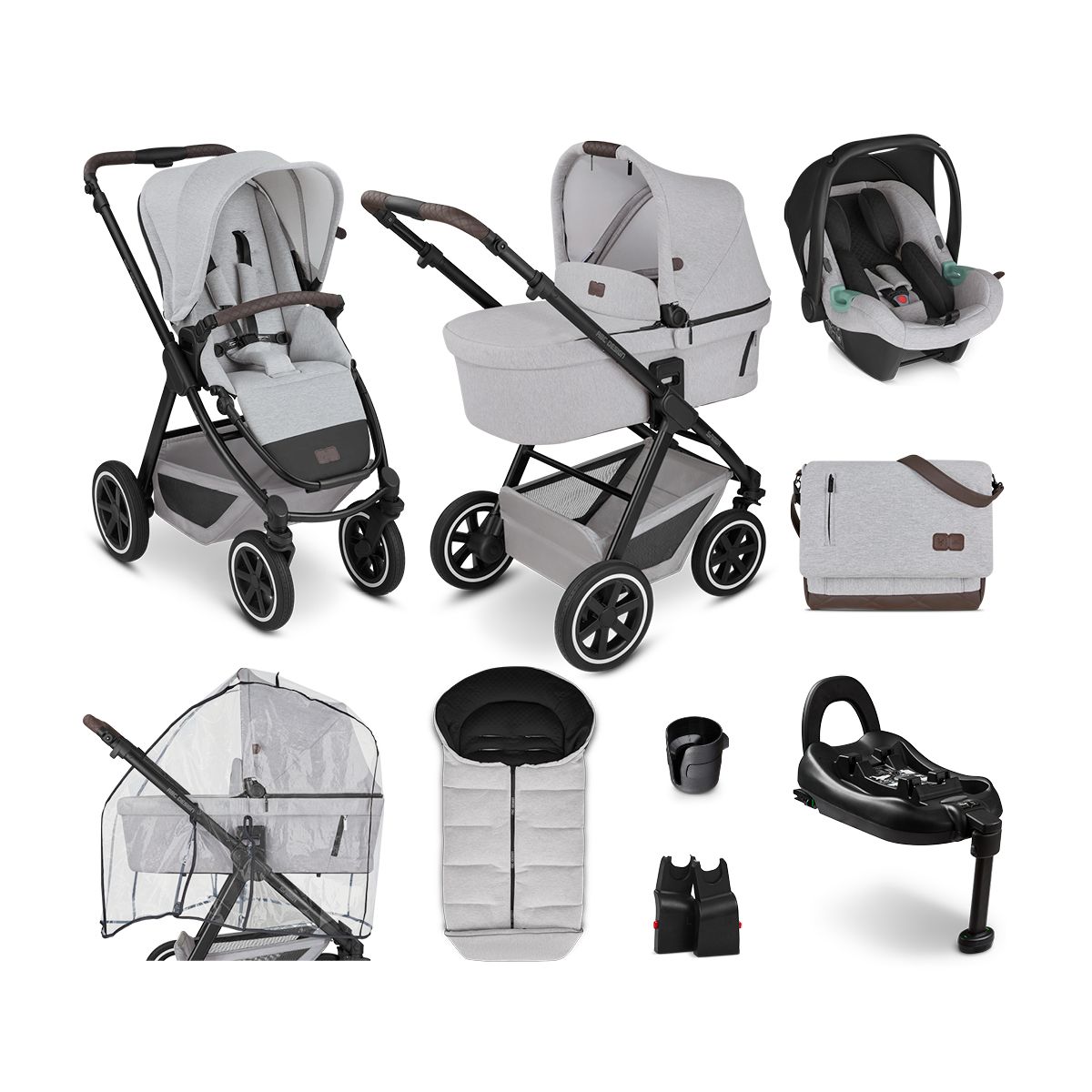 PACKAGE INCLUDES: ABC Design Samba Fashion Edition Stroller ABC Design Samba Fashion Edition Carrycot ABC Design Tulip Group 0+ Car Seat ABC Design Tulip Isofix Base ABC Design Car Seat Adapter for Tulip ABC Design Urban Diaper Bag Fashion Edition ABC Design Winter Footmuff ABC Design Samba Raincover ABC Design Cup Holder ABC DESIGN SAMBA FASHION EDITION 2IN1 PRAM SYSTEM Whether in the city, the park or off the beaten track – your new Samba all-terrain pushchair can cope with any surface. Large, puncture proof air chamber wheels, high-quality ball bearings and the integrated suspension offers maximum comfort and ensures a smooth ride for your baby. Thanks to the practical swivel wheels, you can steer the agile combi pushchair easily around any obstacle. This makes even narrow shopping aisles or maneuvering around passers-by in the city bustle a child’s play. If you are not using the pushchair, it can be folded up very easily & quickly. The small folding size makes it fit into even the smallest car boot. The standalone function offers you maximum comfort, meaning that the Samba pram stands on its own. So you don’t even have to bend down to pick it up. The train is about to leave! Now it’s time to hurry. The nice thing about the Samba is: you can fold it up quickly, even with the seat unit attached. So you can take the combi pushchair with you on the bus or train without taking up too much space. The practical transport lock offers safety and prevents the pram from unfolding unintentionally. The new memory function of the carrycot holders offers you extra ease of use. With one click you can unlock one after the other and always have one hand available to hold the carry handle of the carrycot. This makes it even easier and safer to remove the carrycot from the frame of your pushchair. Tip: You can fold the carrycot to save space and store it even more easily in the boot. FEATURES: Usable from birth up to 22 kg Suitable for city and country Compact folded size Folds wit