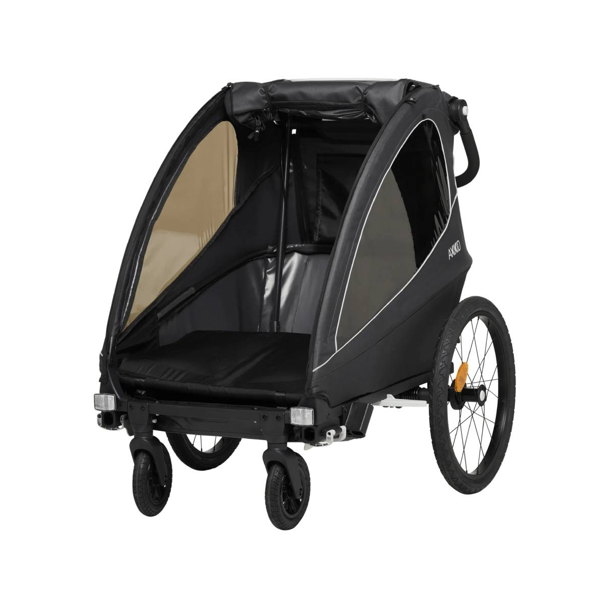 Axkid Grand Tour: The Ideal Family Companion for Everyday Adventures. Prioritising Safety and Comfort, that offers features such as an adjustable resting mode, spacious seating for two children and an extensive cargo mode. Experience peace of mind and enjoyable journeys with Axkid Grand Tour. The Ultimate Family Hero: Axkid Grand Tour ? Your All-in-One Solution Discover the Axkid Grand Tour, a versatile and reliable companion designed to meet all your family?s transportation needs. This remarkable product effortlessly adapts to any situation with its 4-in-1 functionality as a bike trailer, jogging stroller, everyday stroller, and cargo mode. Whether you?re embarking on an outdoor adventure or simply visiting the local park, the Axkid Grand Tour supports your lifestyle every day. Comfortably fitting two children, each seat accommodating up to 22kg, this bike trailer allows you to enjoy your adventures with your little ones by your side. With a total weight capacity of 45kg, you can confidently load the trailer with all your essentials for a day full of fun and exploration. Experience the freedom to embrace various activities and situations with the Axkid Grand Tour, your ultimate companion for flexible family adventures. At Axkid, we prioritise the safety of your family above all else. The Axkid Grand Tour is designed with your child?s well-being in mind. Featuring strategically placed reflective material and logos, this bike trailer maximises visibility, ensuring you and your children are easily seen, even in low-light conditions. The magnetic harness provides a secure and hassle-free fastening experience, keeping your little ones comfortable and safely seated. Additionally, the Axkid Grand Tour is equipped with a reliable parking brake, ensuring the trailer stays securely in place when parked, providing added stability and peace of mind. For enhanced visibility during your adventures, a flag is included, ensuring that you and your precious cargo are always visible