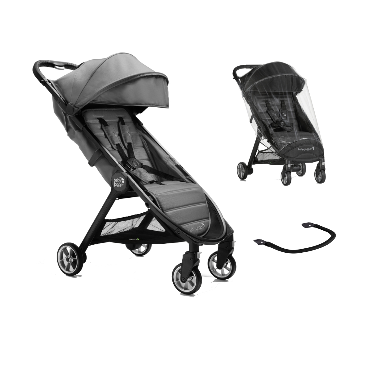 Package Includes: Baby Jogger City Tour 2 Compact Fold Stroller Baby Jogger City Tour 2 Single Belly Bar Baby Jogger City Tour 2 Single Raincover Baby Jogger City Tour 2 Compact Fold Stroller The City Tour 2 folds small for big adventures. Now newly redesigned with infant car seat connection and carry cot compatibility so you can stroll from birth or with toddler on the go. The ultra-compact one hand fold and included carry bag make the City Tour 2 the ultimate travel companion. Weighing only 6. 5kgs, the fully featured stroller includes multiple recline positions, adjustable calf support, UV 50+ canopy and a comfortable padded seat with added depth. Add-on accessories allow for easy customization of the City Tour 2 stroller so you’re equipped to carry on with your day, wherever it may lead you. Features: Suitablr from birt to 5 years Total capacity 27kg (22kg in seat and 5kg in basket) Ultra-Compact One-Hand Fold Durable Composite Tires Adjustable Calf Support Near Flat Seat Recline UV 50+ Canopy with Peek-a-boo Window Carry Bag included Storage Basket 5-point harness Dimensions: Open H99x W49. 5 x L96cm Folded H19x W49. 5 x L60cm Net weight 6. 5Kg Baby Jogger City Tour 2 Single Belly Bar The city tour? 2 Belly Bar easily connects to the stroller to give your child a safe and comfortable area to hold on to while strolling. Baby Jogger City Tour 2 Single Raincover Keep your little passenger protected from any sudden downpours! This raincover for the Baby Jogger City Tour 2 Pushchair has been manufactured from non-toxic, environmentally friendly materials to keep children protected from the rain. It also has a handy zipped panel enabling parents to have access to their child at any time.