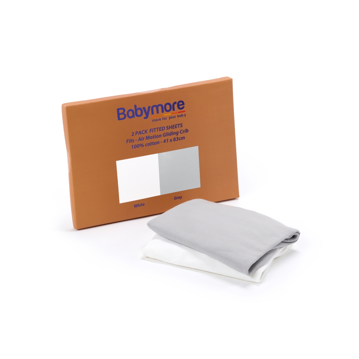 Made from extra soft 100% natural cotton, luxurious double jersey interlock for extra comfort. this pack of two fully fitted sheets are perfect for your Air Motion gliding crib. OEKO-TEX STANDARD 100, Tested to ensure harmless for human health. Features: Content 1 x white 1 x grey fitted sheets Luxurious double jersey 100% cotton Long lasting and soft Light and breathable to help body temperature control Machine washable and tumble dry Fit Air Motion gliding crib or crib mattress size approx 41 x 83 cm