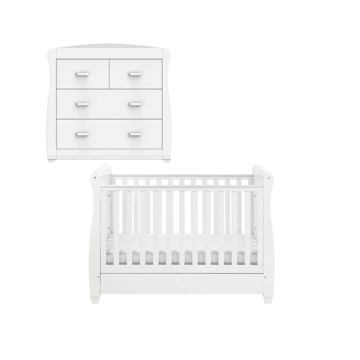 PACKAGE INCLUDES: Babymore Eva Sleigh Cot Bed Dropside with Drawer Babymore Eva Sleigh Chest Changer Babymore Eva Sleigh Cot Bed Dropside with Drawer The Eva cot bed is designed with full of style and versatility, the classic curves compliant either traditional or contemporary scheme. The cot bed made of solid pine wood, it features every convenience function of modern cot bed. Single handed drop side mechanism allow easy access to your baby. Full size drawer on runner provide extra storage. Protective Teething rail on top of both sides. Three base positions to suit baby grew stage. Slat all round for improved visibility and ventilation. Easily convert to junior bed/sofa/day bed. Suitable from birth to approximately four years old. FEATURES: Easily convert to junior bed/sofa/day bed, Meet British and European safety standards; Single handed drop side mechanism allow easy access to your baby Protective Teething rail on top of both sides. Full drawer on runner provide extra storage Three base positions to suit baby grow stage, Slat all round for improved visibility and ventilation Suitable from birth to approximately four years old. DIMENSIONS: Product Height: 100. 0 Centimetre Product Width: 137. 0 Centimetre Product Depth: 66. 0 Centimetre Product Weight: 25. 0 Kilogram Babymore Eva Sleigh Chest Changer With stunning curves and beautiful details, the practical Babymore Bel Chest Changer is a perfect furniture piece for any nursery. The changing area is suitable from birth to 12 months and requires a changing mat size 75 x 45cm. This luxurious changing unit features two half size drawers and two full size drawers that are all deep to provide ample storage space and help keep the nursery tidy. Features: Quality construction 2 half size and 2 full size drawer Changer suit from Birth to 12 Months Deep drawers for generous storage Require a changing mat size 75 x 45 cm (NOT INCLUDED) Dimensions: Assembled Size: L 98 x D 54 x H 95 CM