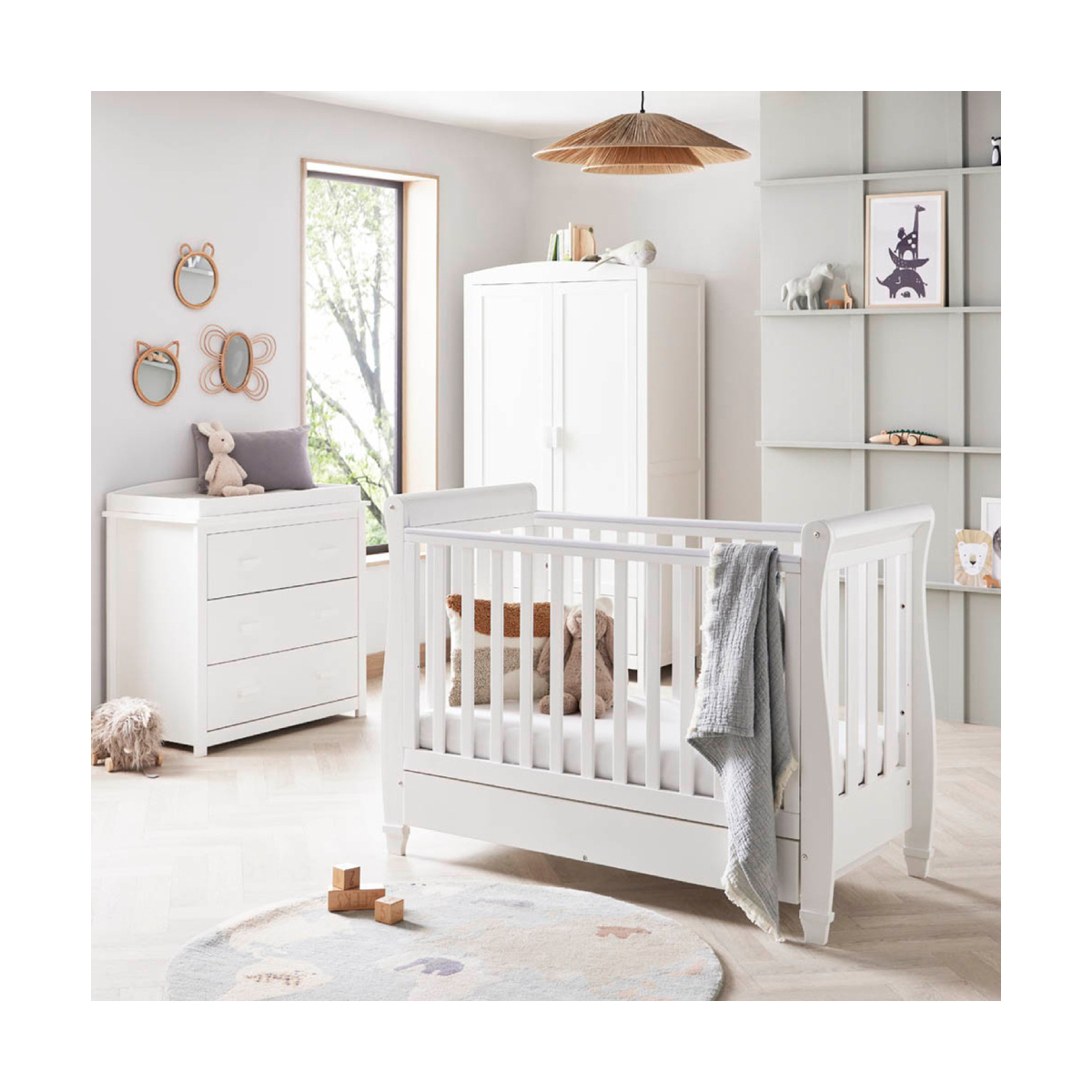 PACKAGE INCLUDES: Babymore Eva Sleigh Drop Side Cot Bed Babymore Universal Chest Changer Babymore Universal Wardrobe BABYMORE EVA SLEIGH DROP SIDE COT BED The Babymore Eva Sleigh Drop Side Cot Bed is a simply stunning sleigh cot bed with an elegant curvaceous design. Designed for your child from birth to 4 years old approx., the Eva is expertly crafted with solid pine wood to last through the years. The one-handed drop side mechanism allows for much easier access to your baby and prevents back pain and aches when lifting your child in and out of the cot. The Eva offers three base positions that adjust easily to ensure your little one is safe and secure as they grow. The Eva converts effortlessly from a cot to a seater and toddler bed that is suitable for use until they are 4 years old approximately and provides a smooth transition for your little one. The teething rail on top of both sides protects your baby’s teeth and gums and prevents damage to the cot. The full-width drawer is on a runner and provides additional storage to help keep your nursery tidy. Features: Suitable from birth to 4 years old (approx.) One-hand drop side mechanism Converts easily from cot to bed Adjustable bed base with three positions All round slatted design for visibility and ventilation Protective teething rail on top of both sides Elegant curvaceous sleigh design Solid pine wood construction Meets the latest British and European safety standards Requires mattress size – 120 x 60cm (Available separately) Dimensions: Dimensions: L 137 x D 66 x H 100 cm Weight: 30kg BABYMORE UNIVERSAL CHEST CHANGER Introducing the Babymore Universal Chest Changer ? the perfect addition to any nursery! Crafted with care and attention to detail. From the moment you lay your hands on its smooth and sturdy surface, you?ll know that this is a piece that was made to last. Designed with versatility in mind, the Universal Chest Changer is perfect for changing nappies, storing clothing, and so much more. The spaciou