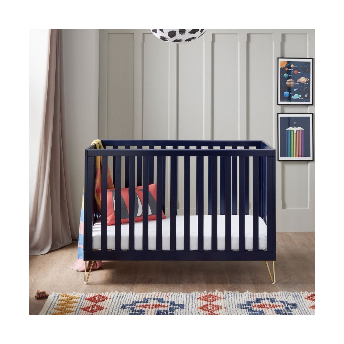 The stunning Babymore Kimi convertible cot bed will be the standout piece of furniture in your nursery. An exquisite combination of contemporary wooden style and retro hairpin legs blend seamlessly to provide a striking fashion statement. The all around slats design provides an airy, open feel that allows full visibility of your little one from any angles. The Scandi-inspired cot bed has been stylishly designed with retro hairpin legs. It offers 3 adjustable mattress heights, teething rails, and can be transformed into a toddler bed, suitable from birth to 4 years old. The hairpin legs are made of high quality steel wire, stable, sturdy and durable, and come with floor protectors included. Features: Suitable from birth to approximately four years old On trend contemporary design with a distinctive style Hairpin metal legs ? heavy duty solid metal, with rubber floor protector Three adjustable mattress base positions Protective teething rail on top of both sides Easily converts to a toddler bed Meets the latest British and European safety standards Compatible with all Babymore 120cm x 60cm cot mattress ranges (available separately) Dimensions: Assembled Size: L 126 x D 64 x H 87 cm