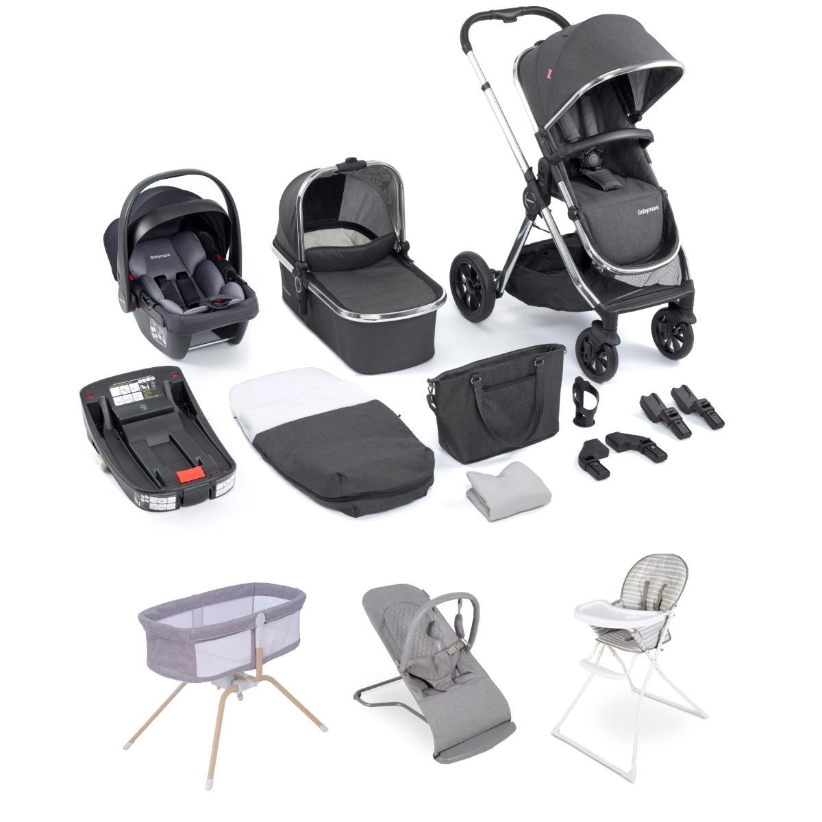 Package Includes: Babymore Memore Pram System Babymore Elevator Babymore Carseat Adaptors Babymore Changing Bag Babymore Changing Mat Babymore Seat Liner Babymore Footmuff Babymore Raincover Babymore Cup Holder Babymore Coco i-Size Carseat Babymore Coco Isofix Base Red Kite Baby Bouner Red Kite Feed Me Highchair Babymore Baby Crib Babymore Memore V2 13 Piece Travel System Bundle with Coco i-Size Carseat and Isofix Base Introducing our new Memore V2 luxury pram and pushchair travel system bundle, which is designed to make parenting easier! This all-in-one package includes everything you need to go out and about in style and comfort with your child. Our 13 piece luxury travel system bundle includes: Chassis, Seat, Elevator, Carrycot, Universal Car Seat Adaptors, Foot Muff, Seat Liner, Rain Cover, Changing Bag, Changing Matt, Cup Holder, Coco i-Size Car Seat, ISOFIX Base. Our luxury Memore travel system features car seat and ISOFIX base, designed to provide you and your little one with the utmost safety and convenience during your travels. With our Babymore car seat, you can rest assured that your child will be protected when out in the car. The car seat is equipped with enhanced side-impact protection, a secure three-point harness, and innovative energy-absorbing materials, all designed to minimise the risk of injury in the event of a collision. The ISOFIX base adds an extra layer of convenience and safety to your travel system. With its easy installation, you can quickly and securely attach the car seat to the base, eliminating the need for seat belts and ensuring a stable and correct fit every time. Versatility is key, and our Memore travel system delivers. The car seat seamlessly transitions from the car to the stroller, allowing you to effortlessly move your sleeping baby without disturbing their precious slumber. The stylishly designed pram is going to be the envy of your friends and is the optimum choice for your precious newborn. It?s lightweight and compact, and