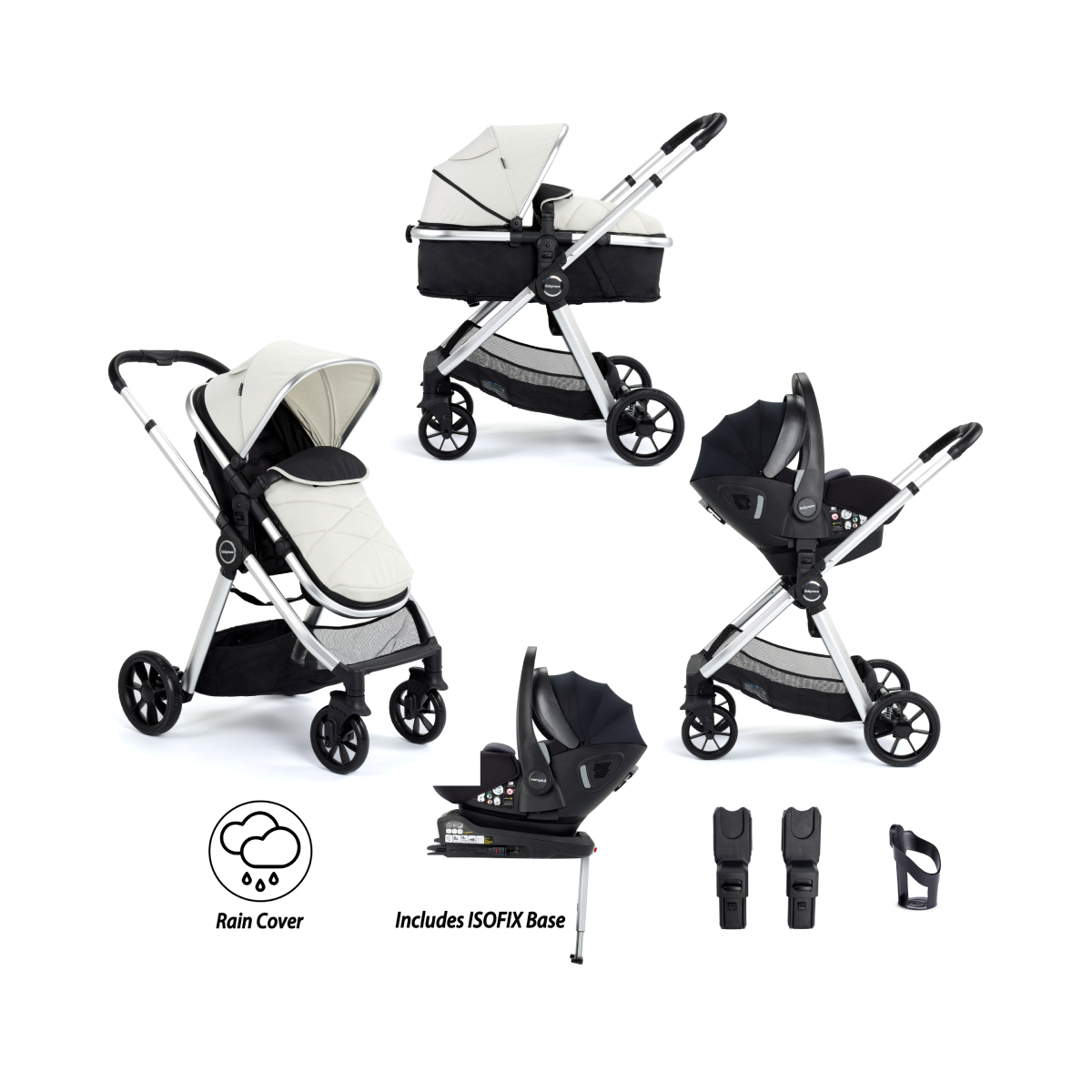 Package Includes: Babymore Mimi Pram System Babymore Pecan i-Size Carseat Babymore Raincover Babymore Footmuff Babymore Carseat Adaptors Babymore Cup Holder Babymore Isofix Base Babymore Mimi 3 in 1 Travel System Bundle with Pecan i-Size Carseat and ISOFIX Base Introducing the super stylish Mimi travel system with i-Size car seat and Isofix base, a game-changer in the world of baby transportation. Suitable from birth to 22kg (approximately 4 years), this cutting-edge travel system combines the convenience of a versatile pram with the unmatched safety of an i-Size car seat and base, ensuring a seamless and secure experience for both parent and baby. The Mimi boasts a thoughtfully designed pram mode, providing a cosy and comfortable space for your newborn to rest and explore the world. The spacious carrycot offers optimal support, while the adjustable canopy shields your baby from the elements. With a simple transformation, the pram effortlessly converts into a sleek and practical pushchair, accommodating your growing child’s needs. The enhanced suspension ensures a smooth ride whatever the terrain and the generous storage basket provides ample room for your essentials, ensuring everything is within reach. Apron, raincover and bottle holder are all included as standard. We understand that convenience is key for parents on the move. That’s why the Mimi is not only super lightweight but also offers a compact fold with an adjustable handlebar, making it easy to navigate through busy streets and store in tight spaces. The generous storage basket provides ample room for your essentials, ensuring everything you need is within reach. But that?s not all! The real star of this travel system is the Pecan i-Size car seat. Engineered to the latest R129 safety standard, it offers advanced protection for your baby during car journeys. The i-Size standard ensures a precise fit by considering your child’s height, providing optimal head and neck support. With features such as enhanced