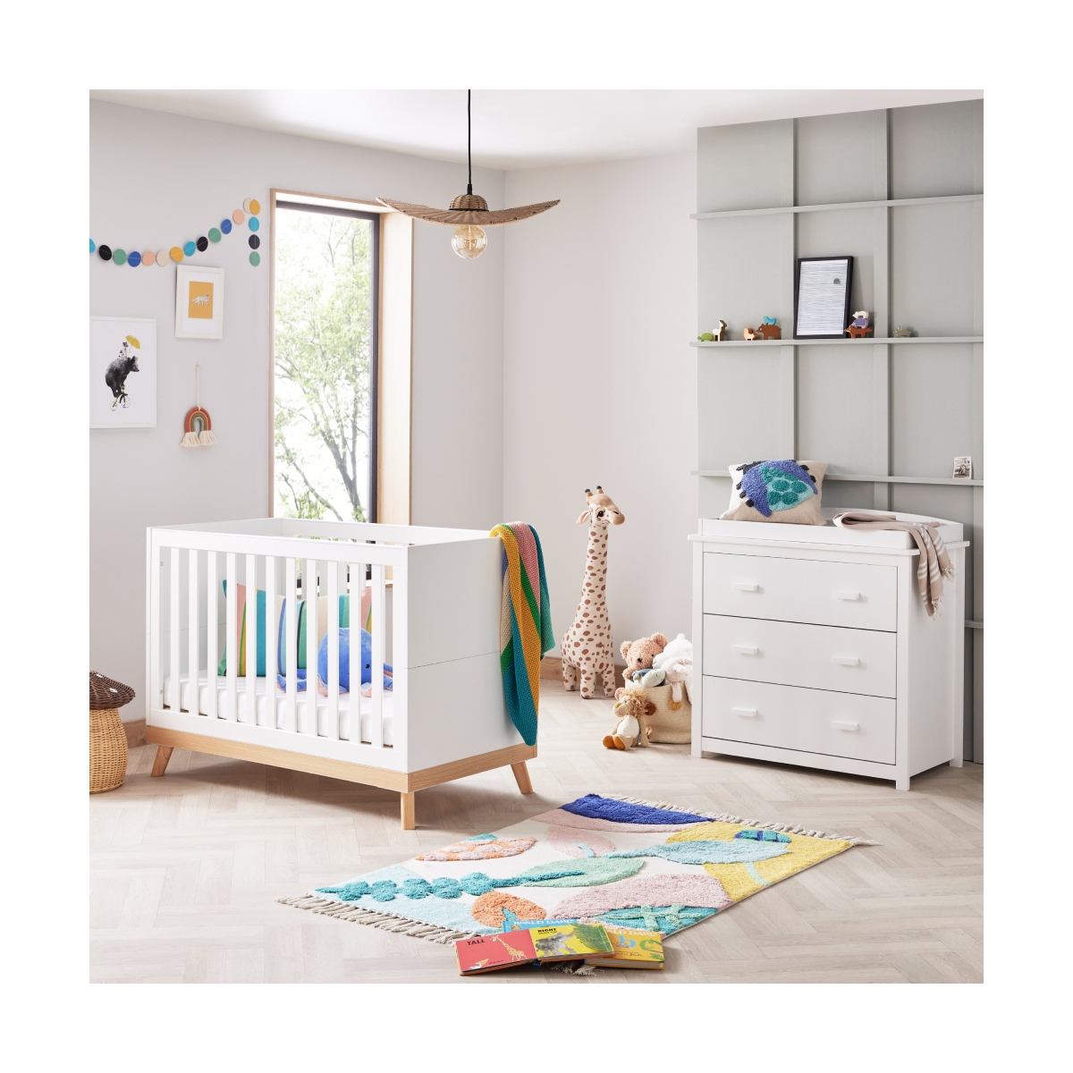 PACKAGE INCLUDES: Babymore Mona Mini Cot Bed Babymore Universal Chest Changer BABYMORE MONA MINI COT BED Introducing our Mona Mini Cot Bed ? the perfect solution for your little one?s sweet slumber! This versatile cot bed is designed to provide the ultimate comfort and safety for your baby, while also being compact and space-saving for your convenience. Crafted from high-quality materials, our Mona Mini Cot Bed is built to last and withstand the wear and tear of everyday use. Its sturdy frame ensures stability and durability, while its sleek and modern design complements any nursery decor. With its compact size, it?s ideal for small apartments or when space is at a premium. The Mona Mini Cot Bed can easily convert from a cot to a toddler bed, making it a smart investment that will grow with your child. This feature provides longevity to the cot and ensures that it will be useful for years to come. The mini cot bed features a 3-position base height adjustment, which enables you to adjust the height of the mattress to suit your baby?s age and developmental needs. This feature ensures that your little one is always safe and comfortable in their cot. The Mona Mini Cot Bed is the perfect solution for parents who want a high-quality, compact and versatile cot bed for their little one. So why wait? Invest in our Mona Mini Cot Bed today and give your baby the sweetest and most comfortable slumber they deserve! Features: Suitable from birth to approximately four years old Protective teething rail on top of both sides Three adjustable bed base positions Easily converts to a toddler bed Meets the latest British and European safety standards Compatible with all Babymore 120 cm x 60 cm mattress ranges (Not included) Dimensions: Assembled Size: L 123 x D 66 x H 89 cm BABYMORE UNIVERSAL CHEST CHANGER With a classic design and beautiful styling, the practical Babymore Universal Chest Changer is a perfect furniture piece for any nursery. The changing area is suitable from birth to 1