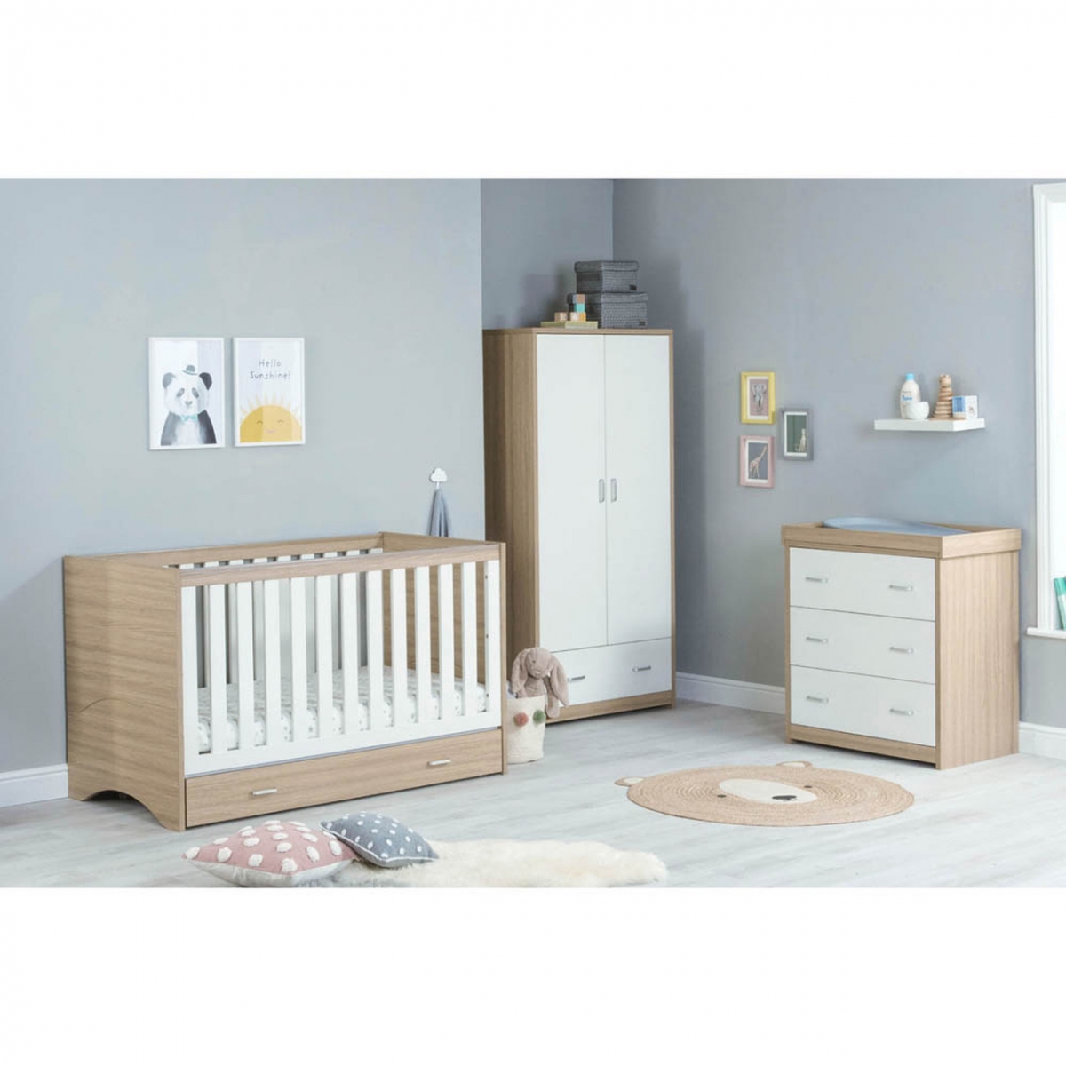 PACKAGE INCLUDES: Babymore Veni Cot Bed with Drawer Babymore Luno/Veni Chest Changer Babymore Luno/Veni Wardrobe Babymore Veni Cot Bed with Drawer Babymore Veni cot beds offers a modern, warm, and clean design, with its neat lines and a beautifully textured Warm Oak wood effect finish. It will sit stylishly in your baby?s nursery. Both the Veni cot beds have three mattress base positions, the highest allowing you to put down, and pick up your new-born baby without too much stress on your back through needlessly bending too low. Then, as your baby grows and starts to move, and explore their world, the mattress base can be lowered through an additional two positions, this keeps them safe and perfectly secure at all ages while the additional teething rails protect their teeth and gums. When your baby is standing and walking, the Luno and Veni can be easily transformed into a sturdy, smart toddler bed that gives them the familiarity of the cot bed they have been used to for so long. Once transformed, their new toddler bed can be used until they are approximately four years old. This cot bed comes complete with a matching under cot bed drawer for additional storage. FEATURES: A beautifully textured Warm Oak wood effect finish Adjustable, three-position base height Teething rails ensure baby?s teeth and gums are protected Cot suitable from birth Convert to bed, suitable to approximately four years old Require UK standard cot mattress size – 140 x 70 CM (Not included) Matching range sold separately – Cot Top Changer, Chest Changer, Wardrobe Drawer Under Cot Bed – INCLUDED DIMENSIONS: Cot Bed Dimensions: L 145 x D 76 x H 88 Cot Bed Weight: 44kg Drawer Dimensions: L 139 x D 62 x H 18cm Drawer Weight: 12kg BABYMORE LUNO/VENI CHEST CHANGER With clean lines and a textured warm oak wood effect finish, the practical Babymore Luno/Veni Chest Changer is the ideal storage and changing solution for your nursery. The changing area is suitable from birth to 12 months and requires a changin