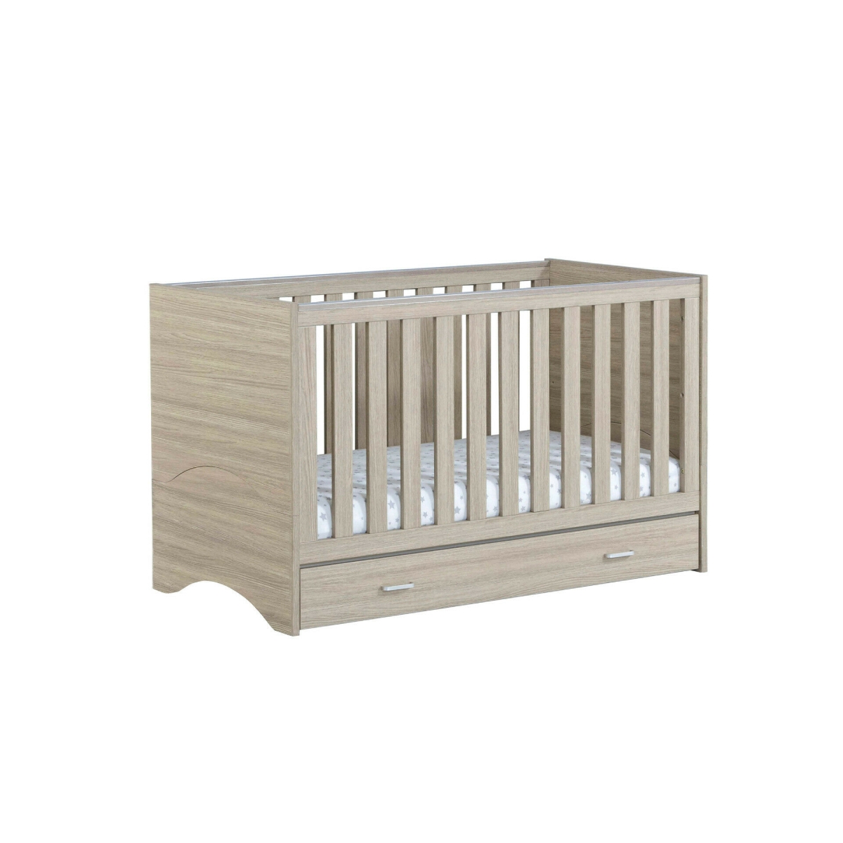 Babymore Veni cot beds offers a modern, warm, and clean design, with its neat lines and a beautifully textured Warm Oak wood effect finish. It will sit stylishly in your baby?s nursery. Both the Veni cot beds have three mattress base positions, the highest allowing you to put down, and pick up your new-born baby without too much stress on your back through needlessly bending too low. Then, as your baby grows and starts to move, and explore their world, the mattress base can be lowered through an additional two positions, this keeps them safe and perfectly secure at all ages while the additional teething rails protect their teeth and gums. When your baby is standing and walking, the Luno and Veni can be easily transformed into a sturdy, smart toddler bed that gives them the familiarity of the cot bed they have been used to for so long. Once transformed, their new toddler bed can be used until they are approximately four years old. Features: A beautifully textured Warm Oak wood effect finish Adjustable, three-position base height Teething rails ensure baby?s teeth and gums are protected Cot suitable from birth Convert to bed, suitable to approximately four years old Require UK standard cot mattress size – 140 x 70 CM (Not included) Matching range sold separately – Cot Top Changer, Chest Changer, Wardrobe Drawer Under Cot Bed – INCLUDED Dimensions: Size: L 145 x D 76 x H 88 cm
