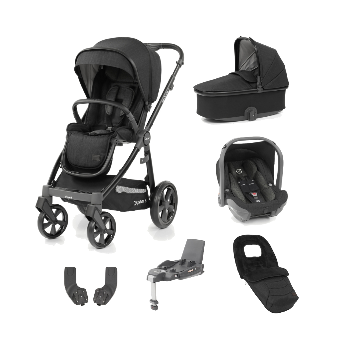 PACKAGE INCLUDES: Baby Style Oyster 3 Gloss Black Finish Stroller Baby Style Oyster 3 Gloss Black Finish Carrycot Baby Style Oyster 3 Capsule Car Seat Baby Style Isofix Base Baby Style Oyster 3 Multi Car Seat Adapters Baby Style Oyster 3 Footmuff Baby Style Oyster 3 Changing Backpack Baby Style Oyster 3 Gloss Black Finish Stroller: The versatile Oyster 3 can be used from birth, thanks to its full lie-flat recline (which can be used whether the seat is positioned forward facing or parent-facing on the chassis and the leg rest can be adjusted too- ideal for naptimes. Keep your little one strapped in safely using the 5-point harness which features softly padded shoulder pads and a headrest for further comfort. You can keep your little one safely out of harmful sun’s rays with the large canopy. It features UV50+ protection, a pull-out sun visor and even a zipped extension to the canopy for when further cover is needed. A ventilation net in the canopy ensures good airflow on those warmer days and an insect net is hidden in a small pocket underneath the seat’s footrest so your little one can travel comfortably. The canopy can also grow as your child does- simply press the release buttons in and you can adjust the height of it and the harness on the chassis without having to rethread the straps. This plus the newly designed strong chassis means that the Oyster can be used all the way up to 20kg for superb longevity and great value. The seat unit can be removed easily and reversed on the chassis, or replaced with the Oyster 3 Carrycot or an Oyster Carapace i-Size infant carrier for when you want to turn it into a 3-in-1 travel system. You can fold the Oyster 3 with the seat in place using an intuitive system and folds extremely compactly for a pushchair of its size. When folded, the chassis auto-locks for your convenience and free-stands- great for storage and a pull-out handle makes it easy to transport the pushchair. Underneath the seat is a large shopping basket- combined with t