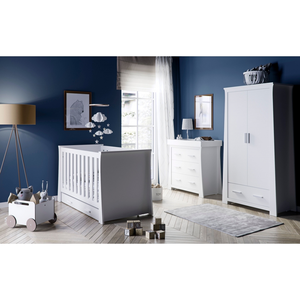 The Babystyle Vancouver Room Set is the perfect combination of contemporary and traditional and is finished beautifully in white to create a nursery for that ideal nursery for your little one. Vancouver Cot Bed: Featuring the classic sleigh style with a modern theme, the Vancouver Cot Bed is suitable from birth and provides a safe and comfortable environment for your little one to sleep. The multiple mattress heights mean you can have your little one up high, making it easy to lift them in and out and as your child grows, the base can be lowered to stop your toddler climbing out. The sides can be removed once your little one is around 18 months old to create a junior bed. Suitable from birth to 4 years (approx.) Multiple mattress heights Converts to junior bed Vancouver Dresser: The Vancouver Dresser has a chest top changer to provide a convenient changing area that can be removed when it is no longer needed to leave a flat surface for storing belongings. There are also three spacious drawers to offer ample storage space for all those essentials. Suitable from birth to 12 months Removable chest top changer Three spacious drawers Vancouver Wardrobe: The Vancouver Double Wardrobe provides abundant storage with its lower drawer and hanging rail to ensure there is plenty of space for clothing and belongings. Lower drawer Hanging rail Dimensions: Vancouver Cotbed: W79cm x L162cm x H92cm Vancouver Wardrobe: W99cm x H185cm x D50cm Vancouver Dresser: W94cm x H98cm x D54cm