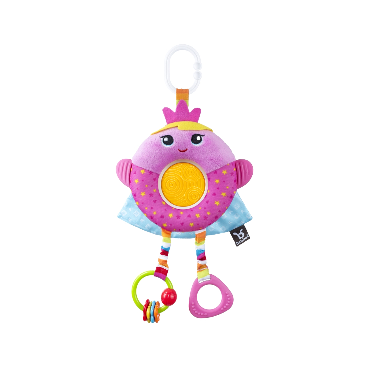 This Benbat travel toy is a great way to keep your child entertained when on the move or at home. This toy has multiple development attributes including a teether, dazzle effect circle and a crinkly cape. This toy encourages babies to explore and develop their skills. Features: The small rings and the stretchable legs encourage the baby to grip them firmly. A variety of fabrics and materials offering a special feel. Stunning effects to catch baby’s eye. The Crinkly material and the sound of the toys swaying, all contribute to a variety of interesting sounds. Soft textured plastic arms and legs help with teething The Peek-a-boo cape promotes a “now you see me, now you don’t” effect Easily attaches to most objects with the unique clip