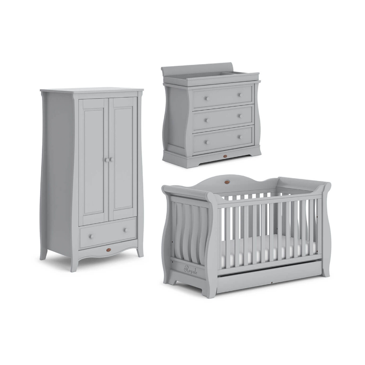 Package Includes: Boori Sleigh Royale Cot Bed Boori Sleigh 3 Drawer Dresser with Sleigh Changing Station Boori Sleigh Wardrobe Boori Sleigh Royale Cot Bed The Sleigh Royale Cot Bed from Boori is a stylish, versatile Cot Bed that is suitable from birth right up to around 5 years, easily converting to a junior bed as your little one outgrows their cot. It can even be transformed into a comfortable sofa as they continue to grow. This Cot Bed can be set to one of two base heights as well as utilizing the Dropside design to allow easier access to your baby. The side panels also feature teething rails, allowing the cot to be refurbished as your little one grows. There is even an integral under-cot tidy drawer to give you extra storage space. Please note this Cot Bed is supplied flat packed for easy home assembly; full instructions are included and all Boori Furniture comes with 5 years manufacturer’s warranty. Features: Suitable from birth up to 5 years old Beautiful design with ‘Royale’ carved calligraphy on end panels Made of solid sustainable wood with nursery-friendly paint finish Adjustable mattress base – 2 heights Converts from cot to toddler bed Includes integrated under-cot drawer Packed flat for easy home assembly with full instructions included Requires 132 x 70 cm cot bed mattress (available separately) Toddler Bed Guard Panel sold individually Dimensions: Dimensions: L 157 x W 80 x H 105 cm Distance from ground to base (higher position): 42cm Distance from ground to base (lower position): 22cm Weight: 62. 5 kg Boori Sleigh Wardrobe The Sleigh Wardrobe from Boori is a wonderful addition to the Sleigh collection and would fit beautifully into any nursery. Featuring a very spacious main compartment with shelf above and two hanging rails, as well as a fully extendable drawer in the base, this Wardobe is as spacious as it is stylish. This wardrobe features adjustable door hinges and is constructed from sturdy materials. Requires self-assembly – full easy-to-follow