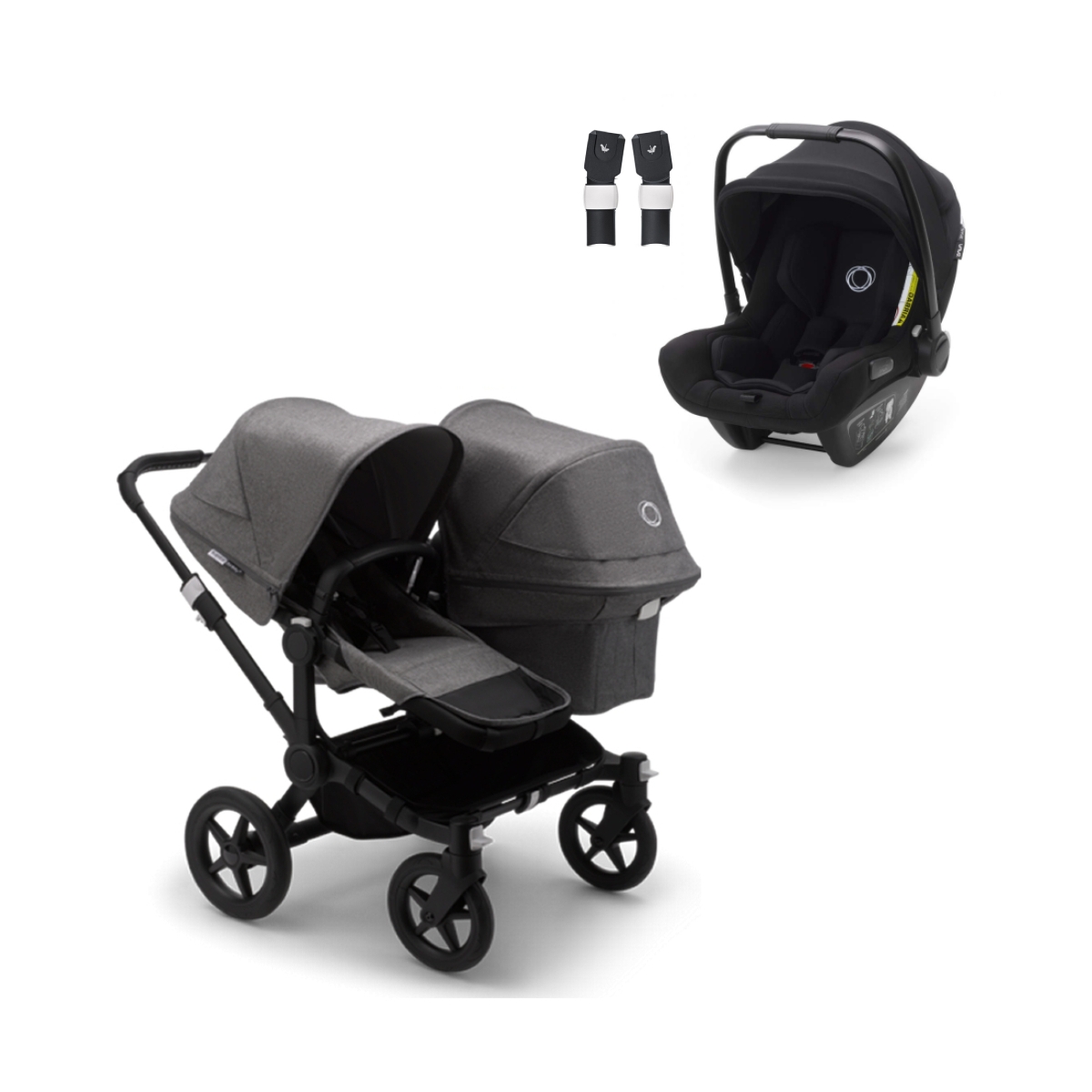 This Package Includes: Bugaboo Donkey 3 Duo Pushchair-Black/Grey Melange Bugaboo Turtle Air by Nuna i-Size Group 0+ Car Seat-Black Bugaboo Car Seat Adaptors Bugaboo Donkey 3 Duo Pushchair: A kid (or two), check. Huge load of shopping, check. Everyone on board, and most importantly happy, check. Much of parenthood is about being prepared for all eventualities. And the bigger the family, the bigger the stroller (usually) in order to do that. But there is a stroller that takes everything you need on board, and is still small enough to fit easily into your family life, your apartment, and also through standard doorways ? the Bugaboo Donkey 3 Duo. Side by side strolling that builds companionship – A look. A touch (OK, sometimes more of a poke). You can?t help but smile at their interaction. Extra sibling connection is built into the Bugaboo Donkey 3 Duo because of the way you can arrange your two children side by side, each one riding in equal comfort and one facing the other so they can always see each other. A stroller designed for born friends. Most the time. Add the Bugaboo wheeled board on the back for a toddler, and it takes 3 kids and all of your shopping at once. Smaller than you think – The Bugaboo Donkey3 Duo is only 74 cm which means that it’s smaller than you think. It’s narrow enough to maneuver easily through standard doorways while still carrying everything you need. Lightest drive/push, with extra stability designed-in – As with all Bugaboo strollers, there is the extra technology to ensure it?s the lightest drive, even when handling the weight of all your kids (and your shopping). One-hand push while you drive makes navigating city streets easy, keeping one hand free for everything else, and a really small turning circle allows you to get back to pick up that lost sock in an instant. The Bugaboo Donkey 3 Duo has a much more stable center of gravity for those quick turns due to the dual side by side carriage design. Large, lighter foam, puncture-proof Bug