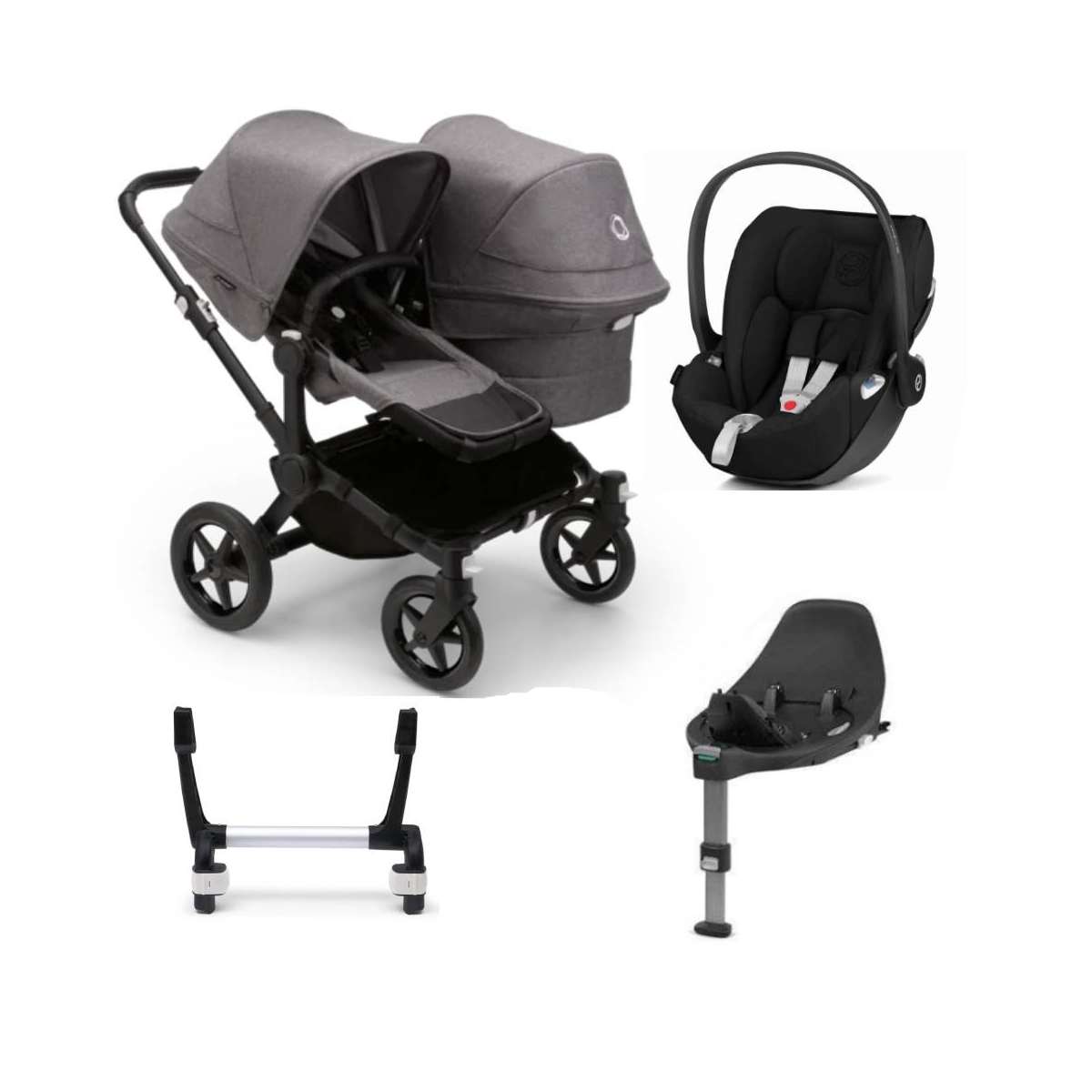 Package Includes: 1 x Bugaboo Donkey 5 Duo Pushchair 1 x Cybex Cloud Z2 i-size Group 0 + car seat 1 x Cybex Base Z2 1 x Bugaboo Donkey Adapter – Mono Bugaboo Donkey 5 Duo Pushchair: Let your children discover life together with the new and improved side by side double pushchair . Convert the pushchair from single to double in just three clicks and keep your little co-pilots side by side from birth to toddler. The reversible seats let siblings face each other, face you or face the exciting path ahead. It?s smaller than you think, and ready to go with just a one hand push Meet the Bugaboo Donkey 5?the stroller that grows with your family. Offering multiple configurations, both as a single or double & twin stroller, the Bugaboo Donkey 5 is versatile, easy to push, and ready for the future. Ready from day one, the Bugaboo Donkey 5 is compatible with different car seats. You can pair it with a car seat or use it with the bassinet during the first months, and then transition to the toddler seat as your child grows. And if you?re thinking of expanding your family, you can easily convert it in just 3 clicks so it can carry 2 children. No matter which configuration you choose, the Bugaboo Donkey 5 is small enough to fit through standard doorways, and it’s perfectly designed to hold up to 22 kg / 48. 5 lbs in one go! Easy to maneuver, thanks to its side-by-side geometry, you can steer it with one hand and go up sidewalk curbs even when it?s fully loaded. When using it in the mono configuration, it comes with an expandable side-luggage basket with 35 liters capacity. The side-luggage basket also comes with an integrated zipper at the top, increasing its capacity as it transforms into a large tote bag so that you can keep your essential items or groceries protected from the elements?or from curious little hands. The new and improved fold and unfold of the Bugaboo Donkey 5 means you’ll be able to start and stop adventures with ease. FEATURES Side by side double pushchair design t