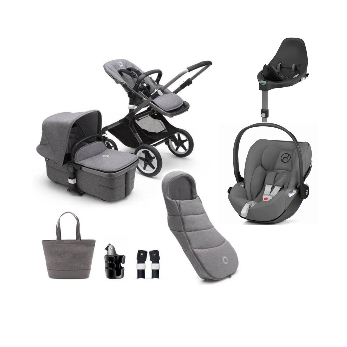 THIS PACKAGE INCLUDES: 1x Bugaboo Fox 3 Complete Pushchair-Graphite/Grey Melange 1x Bugaboo Car Seat Adapter 1x Bugaboo Footmuff 1x Bugaboo Cup Holder 1x Bugaboo Changing Bag 1 x Cybex Cloud Z i-Size-Grey 1 x Cybex Cloud Z Base BUGABOO FOX STROLLER: The Bugaboo Fox 3 Ready-To-Go Bundle is the most comfortable go-anywhere, do-anything bundle for you and your little one. Improved ergonomic design features and colourful customisation options make it one of the safest and most eye-catching rides in town. Innovation is at the heart of everything Bugaboo do. 21 years after starting a pushchair revolution they continue to bring smart solutions to parents and the Fox 3 is no exception. Their designers were determined to make the iconic Fox pushchair even easier to use, even more comfortable to manoeuvre, and even safer to ride in while also bringing more vibrancy and colours into strolls all around the globe. FEATURES: Chassis is specifically designed to be sleek + sturdy Super comfortable go-anywhere, do-anything design Improved ergonomic features + colour customisation options Innovative central joint works in perfect harmony with the rest of the pushchair Unique wheel spring suspension lets you glide over bumps + turn a tight radius Be ready for adventures on any terrain with your newborn or toddler with both a bassinet + seat available Footmuff features a two-way zipper to easily unzip top cover + folds into a small package for easy storage Iconic central joint paired with 4-wheel suspension + large puncture-proof wheels make for a smooth, steady ride Outer ridge of the wheel has less contact surface with the ground, preventing wear + making the pushchair easier to push Cybex Cloud Z i-Size Plus Group 0+ Car Seat-Grey: The all-new Cybex Cloud Z i-Size Plus infant car seat in features a revolutionary near-flat lying position reducing the risk of breathing difficulties for newborn babies. The Plus version of the Cloud Z boasts premium twill effect fabric. It also features