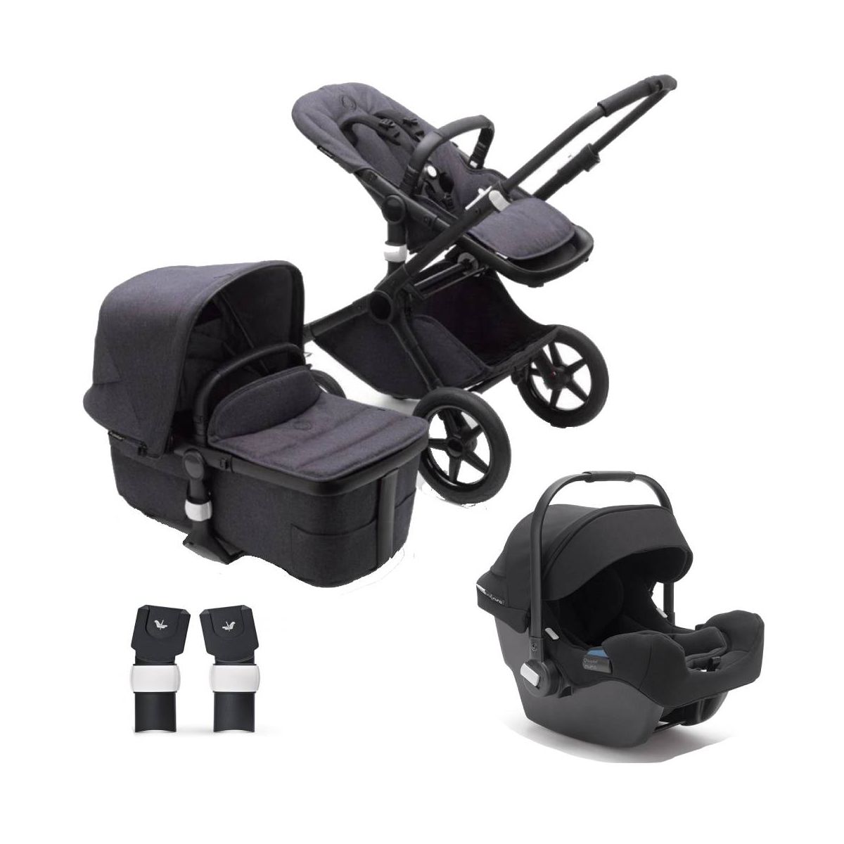 This Package Includes: 1 x Bugaboo Fox 3 Mineral complete pushchair – Black/Washed Black 1 x Bugaboo Turtle Air by Nuna Car seat – Black 1 x Bugaboo Fox Maxi cosi adapters Bugaboo Fox 3 Mineral Complete Pushchair: The Bugaboo Fox 3 Mineral Complete Pushchair in Black/Washed Black is the most comfortable go-anywhere, do-anything pushchair for you and your little one. Improved ergonomic design features make it one of the safest rides in town. The central joint suspension provides stability on even the toughest paths, to keep little ones safe and secure, and the all-terrain wheels mean that you?ll never get stuck. Plus, the quick-click 5-point safety harness ensures maximum security, and minimum fuss when you?re getting ready to go Thoughtfully crafted by Bugaboo’s in-house stylists, the design aesthetic centres around tranquil tones, new premium mélange fabrics and luxurious added details. It?s a unique and timeless look, that is also practical, as the inner fabrics are machine washable. And they don?t just look good, the breezy bassinet has been scientifically designed, with an aerated mattress and maximum ventilation, to make sure that your baby is comfortable. Plus, the sun canopy is UPF50+ protected, with a peek-a-boo panel to ensure that every baby feels connected to the outside world. Innovation is at the heart of everything Bugaboo do. Twenty-one years after starting a pushchair revolution, they continue to bring smart solutions to parents and the Fox 3 is no exception. Their designers were determined to make the iconic Fox 2 pushchair even easier to use, and even more comfortable to manoeuvre. FEATURES: Lightweight, stylish and ergonomic design- ideal for travel, and everyday use as it?s sleek, and practical. Central joint advanced suspension- protects young children from being jostled, and ensures that parents can pusheasily. All terrain wheels- carry the Fox 3 effortlessly over countryside, and city ground. One-hand power push and steer- allowing busy parent
