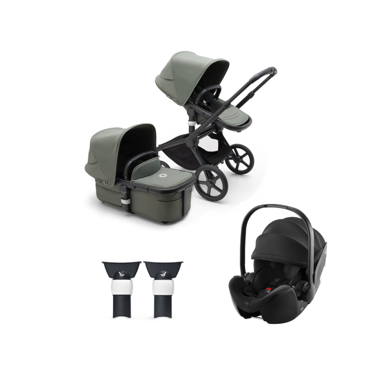 This Package Includes: Bugaboo Fox 5 Stroller Bugaboo Fox 5 Carrycot Britax Baby Safe 5Z Car Seat Bugaboo Fox/Buffalo adapter for Britax-Römer® car seat Bugaboo Fox 5 Complete Pushchair – Black/Forest Green Introducing the Bugaboo Fox 5, the all-terrain stroller for the best ride ever. Go further than ever imagined. The Bugaboo Fox 5 is our most comfortable and easy to use go-anywhere stroller. ?Offering smooth ride on all terrains, easy handling and comfort to your child ? from newborn to toddler. Ready for any off-road adventures. The Fox 5 is great for exploring the world together with your child, combining quality, comfort and style in one. It boasts four extra large puncture-proof wheels and advanced suspension for a smooth ride on every terrain. Best-in-class manoeuvrability. The Fox 5’s unique chassis design has been specifically designed to be sleek and sturdy. The improved gravity point combined with the short wheel distance makes it even easier to manoeuvre or ride on and off curbs. You’re always in total control going in any direction. Get going with just one hand. Everything in the Fox 5 has been engineered to perfection for the easiest handling. Use one hand to adjust the handlebar height, recline the seat or even fold the stroller ? leaving the other hand free to carry your baby. Comfort at any age and stage. The spacious and breezy bassinet with aerated mattress will keep your baby comfortable and regulate their temperature all year round. When your child grows older, switch to the ergonomic padded seat that’s also extendable by 10 cm (by extending the sun canopy or lengthening the footrest) for optimal comfort of your toddler. Built to last with sustainable materials. The Fox 5 is made with the future in mind, using bio-based plastics and PFAS-free fabrics. ?Replaceable parts, washable fabrics, puncture-proof wheels and high-quality materials also mean this stroller will be with your family for years to come. Explore the world in style. The Fox 5 is ava