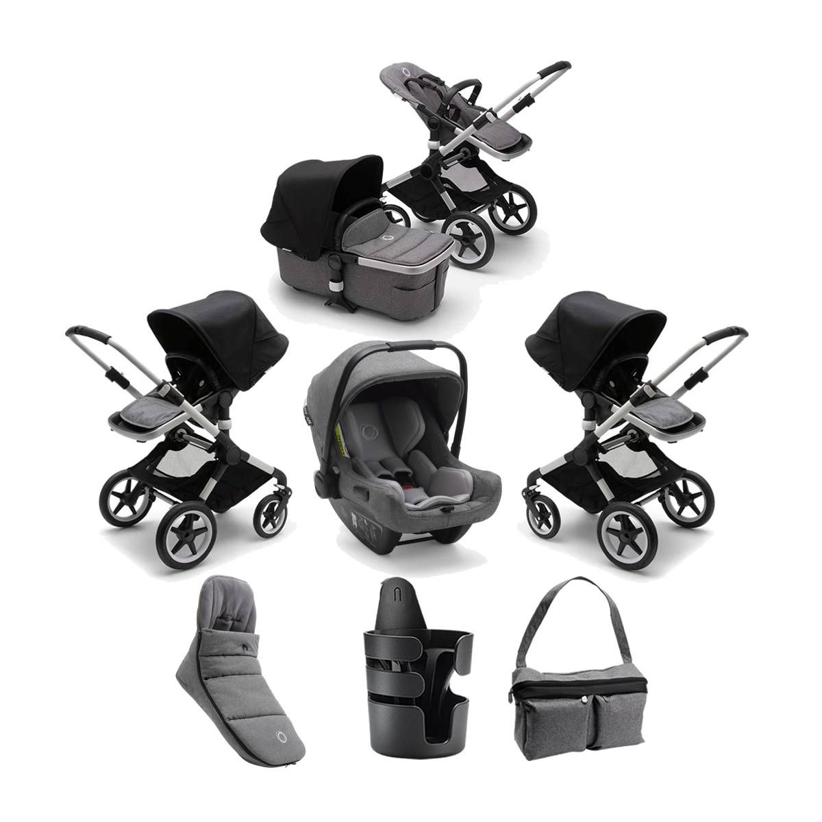 This Package Includes: Bugaboo Stroller Bugaboo Carrycot Bugaboo Side Basket Bugaboo Turtle Air Car Seat Bugaboo Footmuff Bugaboo Cupholder Bugaboo Organizer Bugaboo Adapters Buga Boo Fox2 Stroller & Carrycot Meet the new Bugaboo Fox2 pushchair – the ultimate comfort pushchair. It’s the perfect pushchair for going outdoors, travelling and shopping – and is always easy to use and smooth to push. The Aluminium with Black has the lightest push, take this pushchair anywhere, from city streets to snowy trails – the advanced all-wheel suspension and big tyres ensure a smooth yet stable ride for you and your child no matter the surface. The easy-access underseat basket gives you the option to bring along everything you need. This pushchair features an ultralight frame with a seamless fold that you can easily carry – we love the super-compact fold for stress-free storage. Features: Suitable from birth up to max. 22kg (EMEA/UK/ASIA) Central joint suspension & front wheel suspension for the most comfortable ride Extendable sun canopy with peek-a-boo & breezy panel in one Changeable bassinet & seat fabric, sun canopy, grips & wheel caps ? Easy access storage pockets on bassinet Integrated attachment points for a seamless integration with Bugaboo accessories High seat placement: 59 cm from the ground ? Flip-flop friendly brake (ball point principle) Memory buttons to remove bassinet & seat with one hand ? One hand recline with ergonomic handle 1 Piece compact & self standing fold 2 Piece extra compact fold Beach mode (2 wheel) All fabrics are machine washable Large, easily accessible under seat basket with storage pockets Dimensions: Product weight: 10. 2 kg / 22. 5 lbs Large front wheels: 8. 5 inch, rear wheels: 12 inch Volume: 30 L / 7. 9 gal Weight capacity: 10 kg / 22 lbs) Bugaboo Turtle Air by Nuna Car Seat The Bugaboo Turtle Air by Nuna Car Seat in Grey Melange is a super light design. It’s easy to lift and carry, the sun canopy lets parents transform the car seat into a cosy
