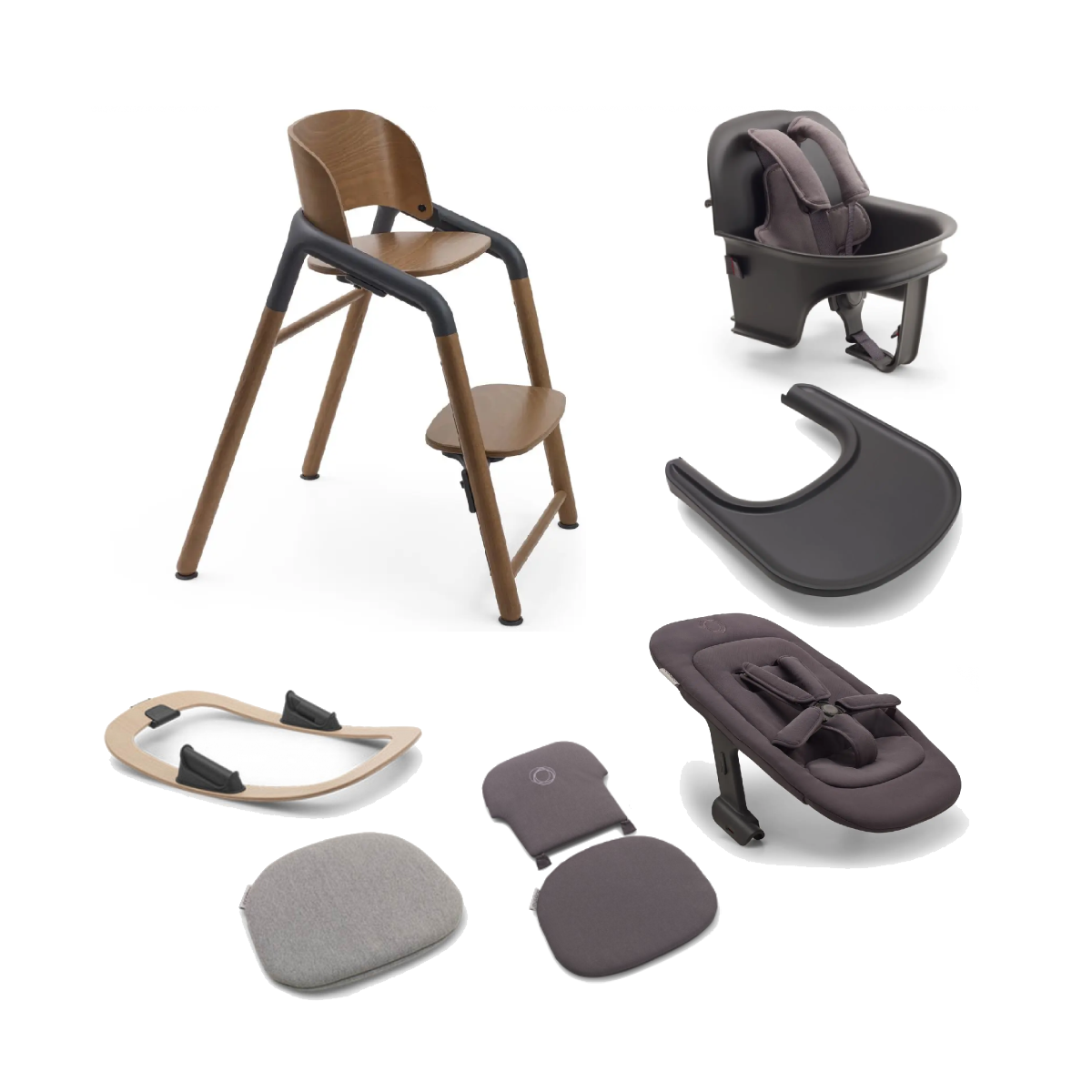 Package Includes: Bugaboo Giraffe Highchair Bugaboo Giraffe Baby Set Bugaboo Giraffe Pillow Set Bugaboo Giraffe Junior Pillow Bugaboo Giraffe Rocker & New born Set Bugaboo Giraffe Tray Bugaboo Giraffe Highchair: The Bugaboo Giraffe High Chair Base is designed for all ages and adjustable in just one second. It?s ready for every adventure and milestone?from the moment your newborn arrives until far beyond childhood. It can adapt to all stages of your child?s growth?from sleepy newborns to squirming toddlers and far beyond. Simply use the snap-on accessories to create five seating positions that meet the needs of newborns, toddlers and older kids. With its sleek triangular shape it offers comfort, stability and freedom of movement, to make every meal an adventure. It is built for splatters, spills and splashes. The durable high chair can be wiped down with a cloth, while the tray is dishwasher safe and the pillows are machine washable. It can hold up to 100kg so will have a place in your home for years to come. It is also built to last, the combination of quality materials and expert craftsmanship make this a durable chair for generations to come. It is crafted from European beechwood certified by the Forest Stewardship Council® for sustainability. All plastic parts are made from ISCC certified bio-based materials, which means the Bugaboo Giraffe?s CO2 footprint is 61% lower than if it was made using conventional plastics. Features: Adaptable to every age and stage of your child?s growth Easily adjustable in one second Safe and sturdy Dutch design Built to last with eco-friendly materials Holds up to 100 kg / 220 lbs Easy to clean Elegant design Dimensions: L59 x W53. 7 x H76. 4cm Bugaboo Giraffe Baby Set: The Bugaboo Giraffe Baby Set snaps on easily to the Bugaboo Giraffe chair to convert it into a snug and secure highchair, suitable for use from 6 to 36 months with a maximum weight of 15kg. The included machine washable 5-point safety harness provides additional security