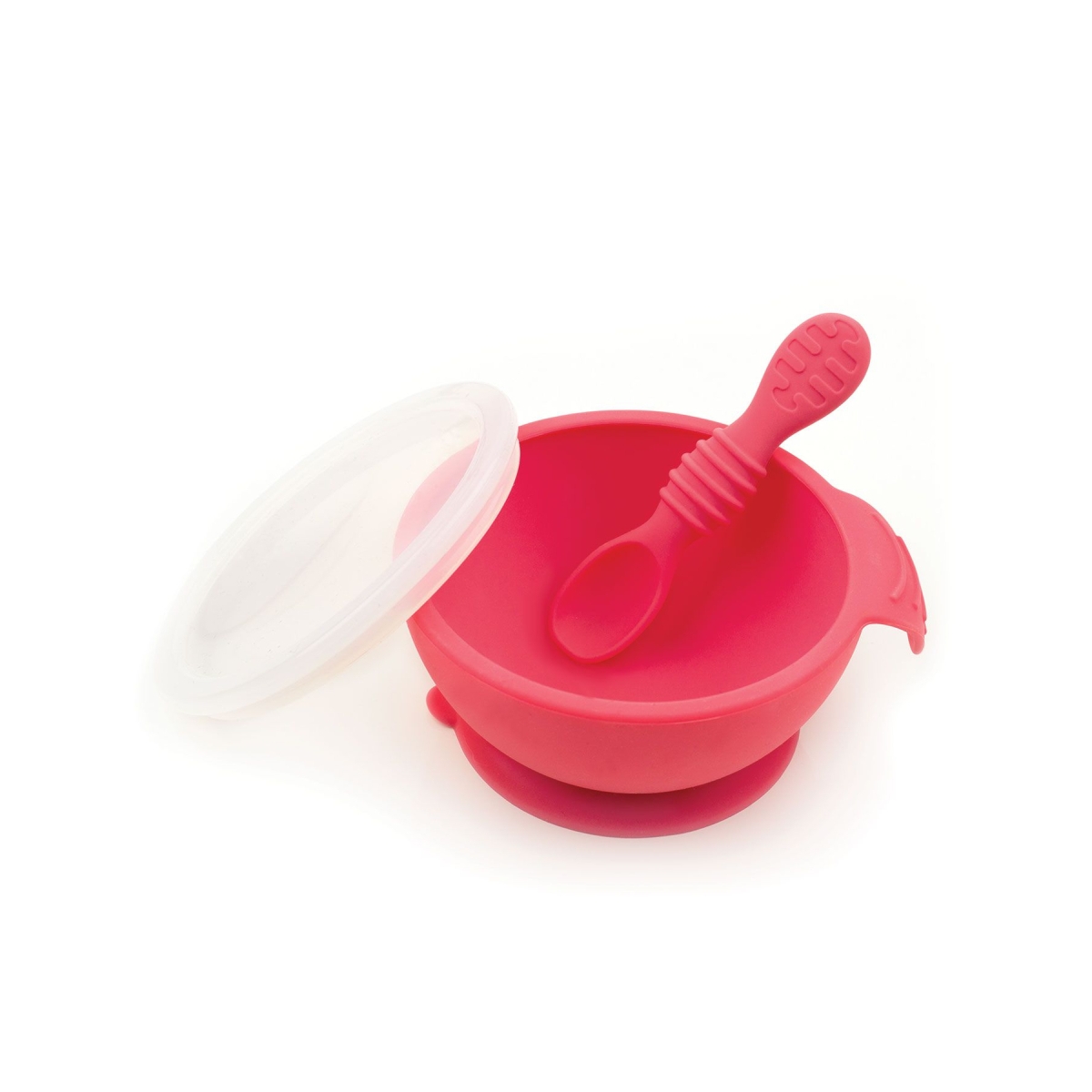 Designed to make the beginning of your little ones weaning journey a little bit easier. Help your baby transition to self-feeding and solid foods using a bowl that prevents any spills and even saves the leftovers! The bowl has a suction base that sticks to highchair trays or most tables, it even has a curved handle for easy holding if the adult wants to do the feeding. This set comes with a double-ended silicone spoon that actually adapts as your baby adapts. One end is for dipping into purees and the other for when your child is ready for scooping solid foods. The clear silicone lid means you can save any left overs for next mealtime! Features: First feeding set including a bowl, spoon and lid in a variety of colours Suction base to stop the bowl from sliding around on the table Withstands high and low temperatures ? take straight from the freezer to the microwave Easy to clean ? either hand wash or put on the top rack of the dishwasher Made from 100% food grade silicone Suitable for ages 4 months + Dimensions: Bowl measures 4. 25 inches Spoon measures 4. 75 inches