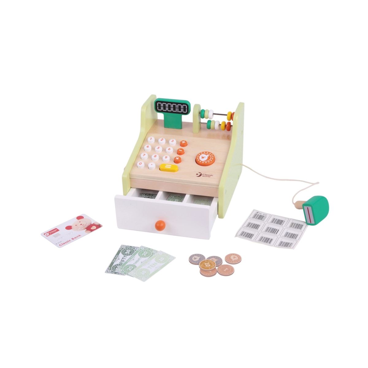 Cash or card? Count the total amount then give back the right change. This cash register includes notes, bank card and coins. It will be a lot of fun while developing the social and communication skills. The special function of this cash register is that when you push the big bear button, the drawer can pop out with cash and coins inside. Classic World have a straight forward philosophy, ‘Happy Playing, Happy Learning!’ Their commitment goes beyond just making great toys, they practise an environmentally safe production process and do more than their part in making a safe and clean world for children to grow up in. Features: wood sourced from sustainable forests environmentally safe production non-toxic paints entertaining and educational high quality toy to stimulate the imagination safe and durable Dimensions: 19 x 20 x 15??????cm