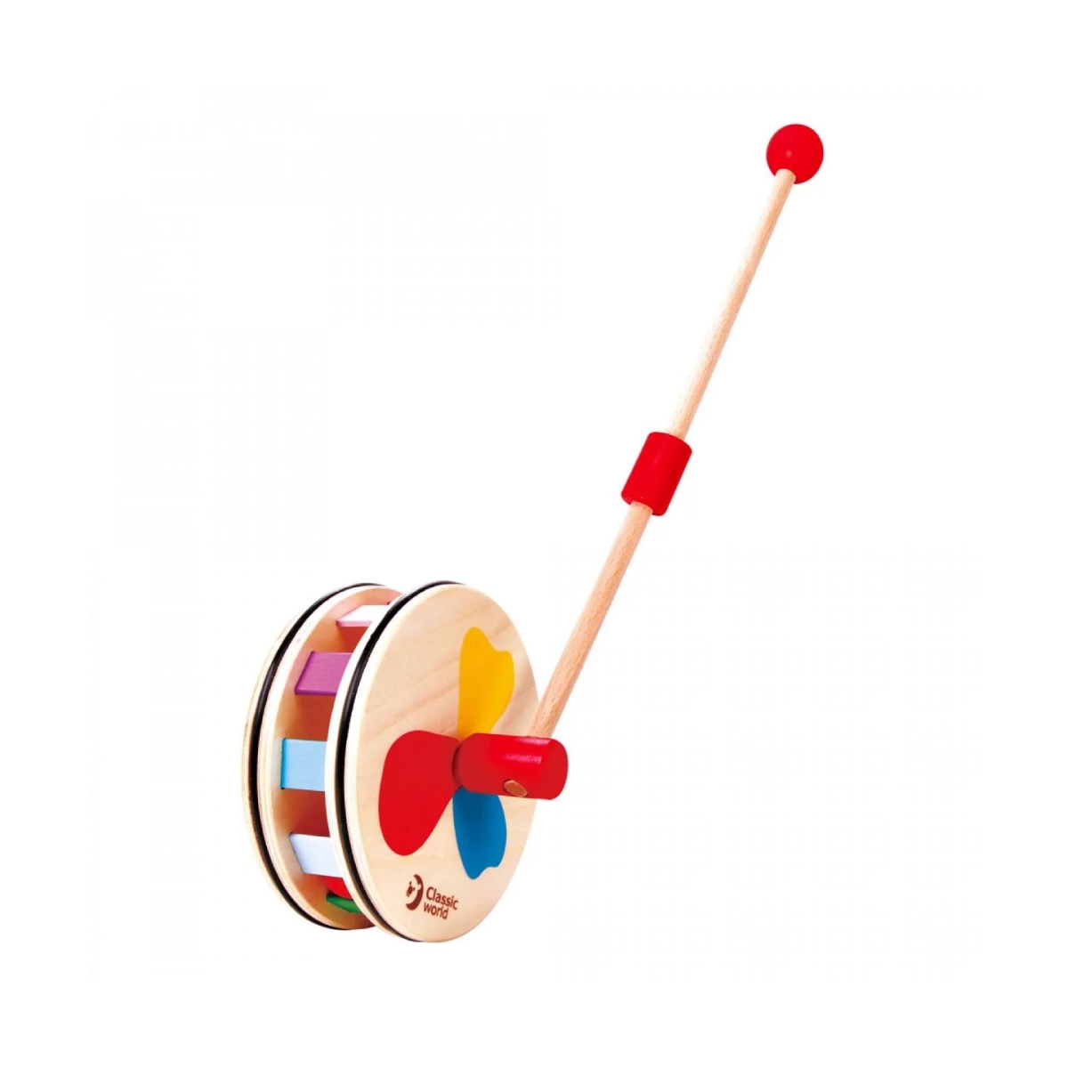This brightly coloured push along rainbow toy is a real classic and will delight youngsters for hours as they walk around. The sturdy design and grippable handle means it is perfect for little learners and will grow with them as they develop coordination and balance skills. The cheerful shapes at the bottom will also provide plenty of visual stimulation. Features: Safe and robust push along toy Helps develop hand eye coordination, strength and encourages walking Made from sustainable wood Recommended age range: 1 year + Dimensions: Size: 38 x 47 x 11cm