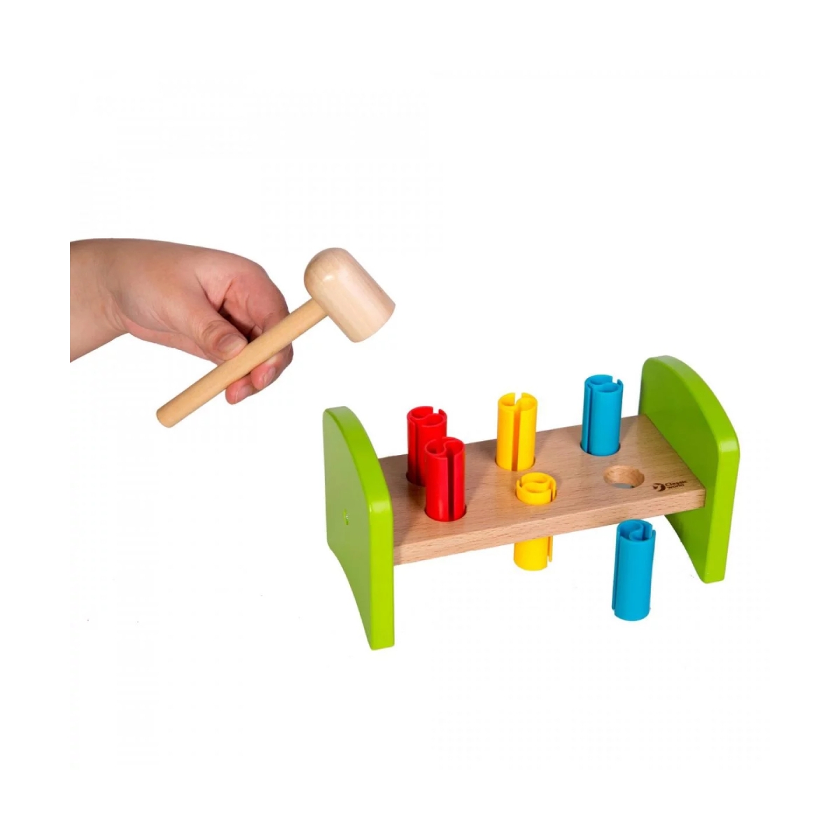 Colourful wooden pounding bench with 6 pegs and a hammer that will help your little one develop their hand-eye coordination and arm strength. When you turn it upside down it rocks from side to side to make the game more challenging and fun! Features: Includes 6 pegs and a hammer Helps develop hand-eye coordination Suitable for 12 months + Dimensions: Size: 20 x 10 x 10cm