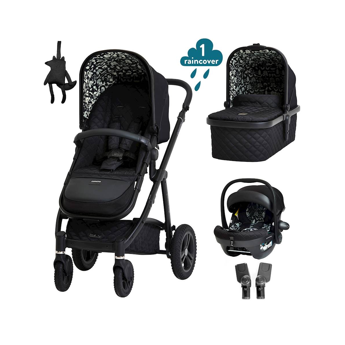 Package Includes: Wow Pushchair & Basket Wow Carrycot with Hood & Apron Carrycot Mattress Raincover Acorn i-Size Car Seat Car Seat Adaptors Wow 2 is the feature-packed luxury travel system with enhanced, all terrain performance and 4-year guarantee. Meet your everyday, premium, enhanced, high-performance, exquisite helping hand. Features: Wow Pushchair: Smooth Ride – Wow 2 in Silhouette has unique dual density rubber skin puncture proof tyres that offer enhanced durability for a smooth ride – great for off-road and all-terrain exploring. Plus, the enhanced suspension brings manoeuvrability and comfort. Wow 2 has a compact fold for easy storage. From-Birth, Multi-Talented Mover – Use the luxury from-birth carrycot with deeply padded mattress for the first 6 months (to approx. 9kg). This features a one-handed release and can be used for occasional overnight sleeping. Then swap over to the reversible pushchair seat with a one-handed recline and adjustable leg rest to make your experience smooth and seamless. The pushchair mode supports up to 25kg so your toddler can use it for even longer. Add the matching Acorn i-Size car seat to turn it into a travel system. Tiny Boot Approved – Wow 2 really delivers on all-terrain performance bringing a smooth off-road experience plus it is Tiny Boot approved, fitting into a Fiat 500. Good All-Rounder – Add the matching Acorn i-Size car seat to make it a travel system. The Acorn i-Size car seat adaptors let you attach your Acorn i-Size car seat to your Wow 2. Clever Stuff. Happy Babies. – Crafted with hidden extras and Cosatto?s famous storytelling patterns, kids love Wow 2 from Cosatto. Bold, bright, and carefully placed, our baby-friendly characters and patterns aim to harness your baby’s early sensory skills. Fire their imagination with Wow 2. Carrycot: From-birth to 9kg carrycot with comfy mattress, carry handle and removable washable liner Carrycot suitable for occasional overnight sleeping UPF 100+ Hood with a one-hand release