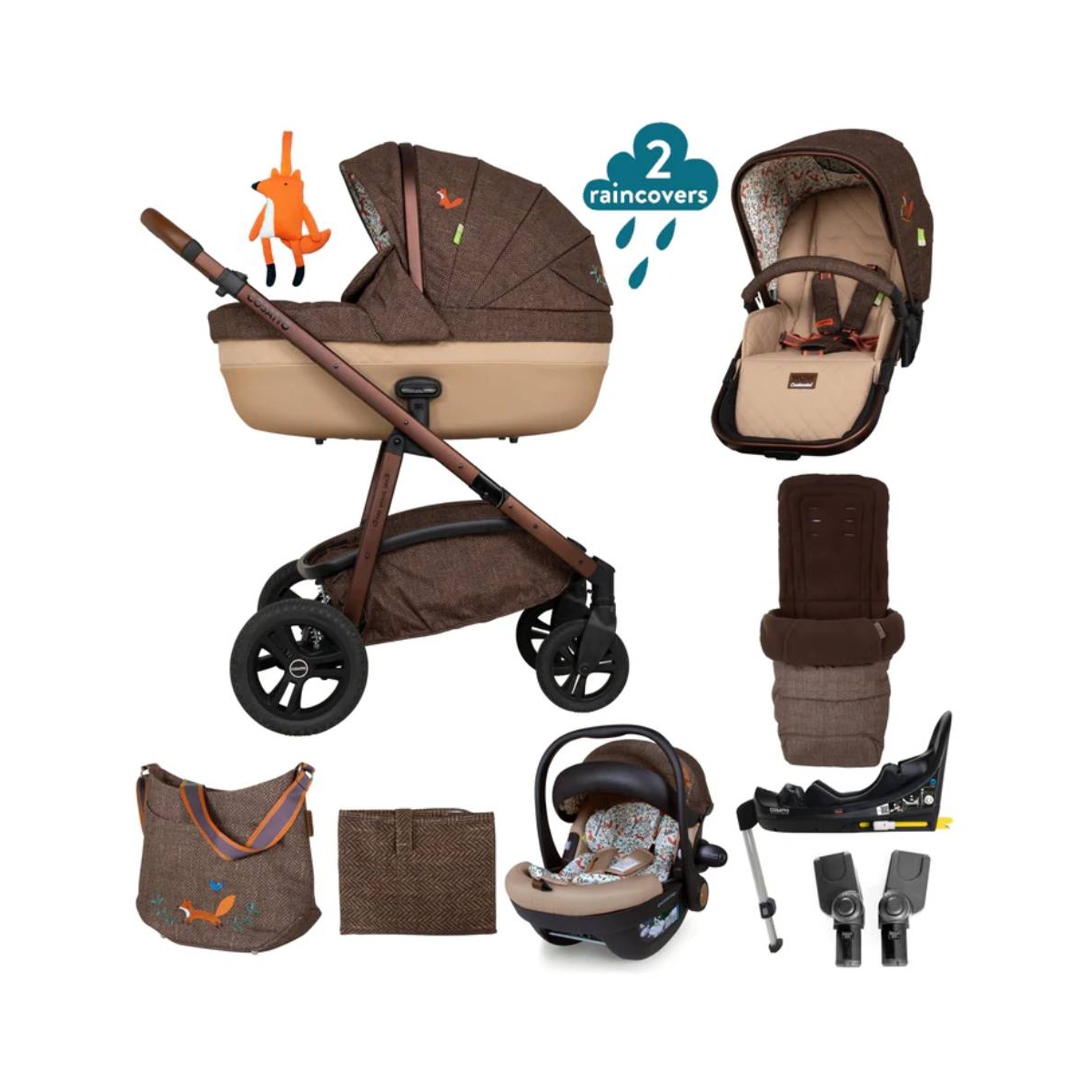 Package Includes: Wow Continental Pushchair Wow Continenta Seat Unit Carrycot with Padded Mattress & cover Carrycot Raincover Seat Unit Rain cover Acorn i-Size Car Seat Acorn i-Size Base Car Seat Adaptors Footmuff Changing Bag 4-year Guarantee card Meet Wow Continental your multi-terrain pram and pushchair great for both town and country. Delivering world-class performance, this pushchair has a striking continental design and is perfect for any situation thanks to the multi-terrain suitability and dual suspension options. A traditional pushchair with modern features, Wow Continental delivers exactly what you need, whenever, wherever you need it. Features: Cosatto Wow Continental Chassis: Suitable from birth to 20kg Dual mode all-round suspension Compatible with Acorn i-Size car seat (car seat and adaptors sold separately) Weather protection winter-flap on the apron with integral viewing window Telescopic leatherette handle lets you adjust the handle height for comfort. Compact, easy-fold aluminium chassis with auto lock. Removable, quick-release premium puncture-proof, multi-terrain wheels Lockable front swivel wheels Super-sized basket with handy compartments 5kg basket weight 1 x Raincovers tailored to the seat unit UPF100+ extendable hood 5 point plus safety harness Cosatto?s famous baby-friendly patterns boost learning and memory skills. Includes travel companion Industry leading 4 Year Guarantee. Cosatto Wow Continental Seat Unit: Suitable from birth to 20kg 4 recline positions ? Including one for new-born One-hand backrest recline Parent and world facing Washable new-born liner for comfort One-hand adjustable calf-support Roomy, comfy seat unit Removable gated bumper bar for easy access Peak-a-boo window on hood Extendable sun visor and toy-loops Exquisite tailoring and upholstery. Chest and tummy pads Cosatto Carrycot: Carrycot suitable from birth to approx. 6 months Washable liner and mattress cover Ventilation window panel Soft interior liner Comfy mattress