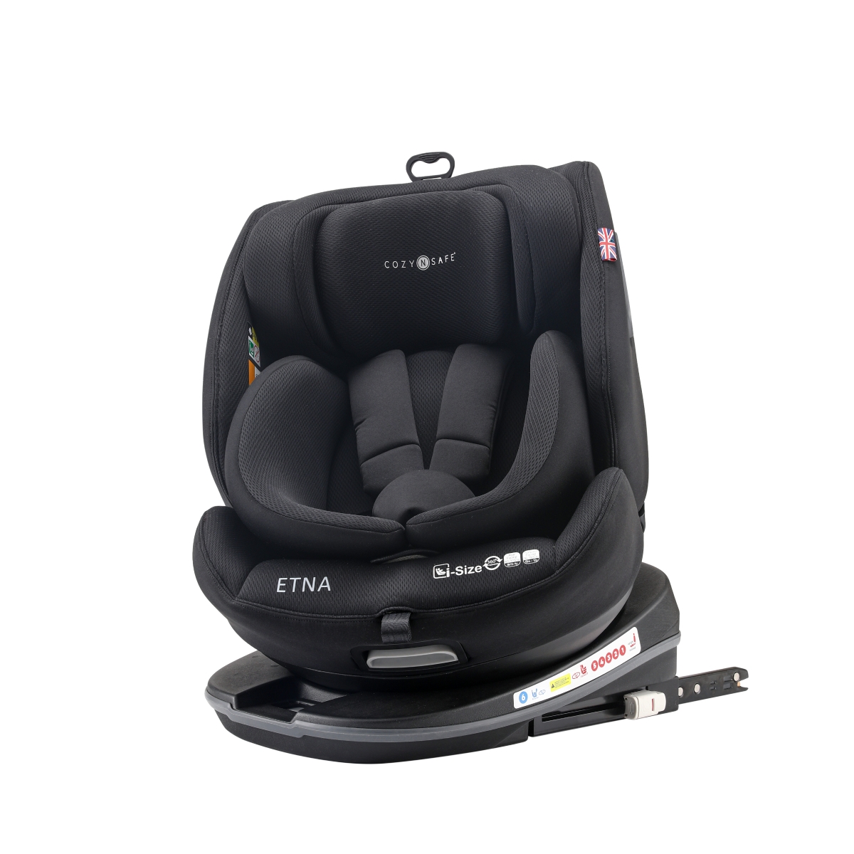 The Cozy N Safe Etna i-Size has the most amount of padding we have EVER put in a car seat. The super deep padding ensures that your baby is truly Cozy N Safe. The padding acts both as a brilliant support for your baby and offers amazing protection against any impacts from the sides and forward or rear collisions. That?s not all, the recline position and padded newborn inserts ensure the seat has a lie flat function to ensure your newborn is in the correct position even on those longer journeys. The i-Size seat is installed in most modern cars using the Isofix and Top Tether system until your toddler reaches 105cm, then simply hide the harness and the seat is installed using the vehicles? 3 point belt. The Etna has an extended rear facing feature allowing you to rear face your baby all the way up to 105cm (approx. 4 years old.) The 360° seat which locks at 90° allows you easy access to your child when putting them in or out the car seat. No more breaking your back bending in and out of the car. The luxurious covers have been manufactured to be both breathable and warm, ensuring your baby is cooler in the summer and warmer in the winter. The car seat is suitable from birth all the way to approx. 12 years old making this the only car seat you need to buy! A 5 point, self-adjusting harness, side impact protection, durable and ventilated shell, deep padding, fully adjustable headrest and 6 recline positions (1 rear facing and 5 forward facing) all combine to please every critic large and small. All covers can be removed and washed in the washing machine on a cool 30°C wash. Features: Birth to 12 years old i-Size Car Seat with 360° one touch rotation feature Suitable from 40-150cm (0 to 36kg) Rear and forward facing positions Extended Rear Facing up to 105cm (approx. 4 years old) Quick Release Top Tether for easy rotation Buckle Release Alarm Fitted using Isofix, top tether and/or vehicle 3 point belt Side impact protection Easy adjustable, 5 point harness with soft pads