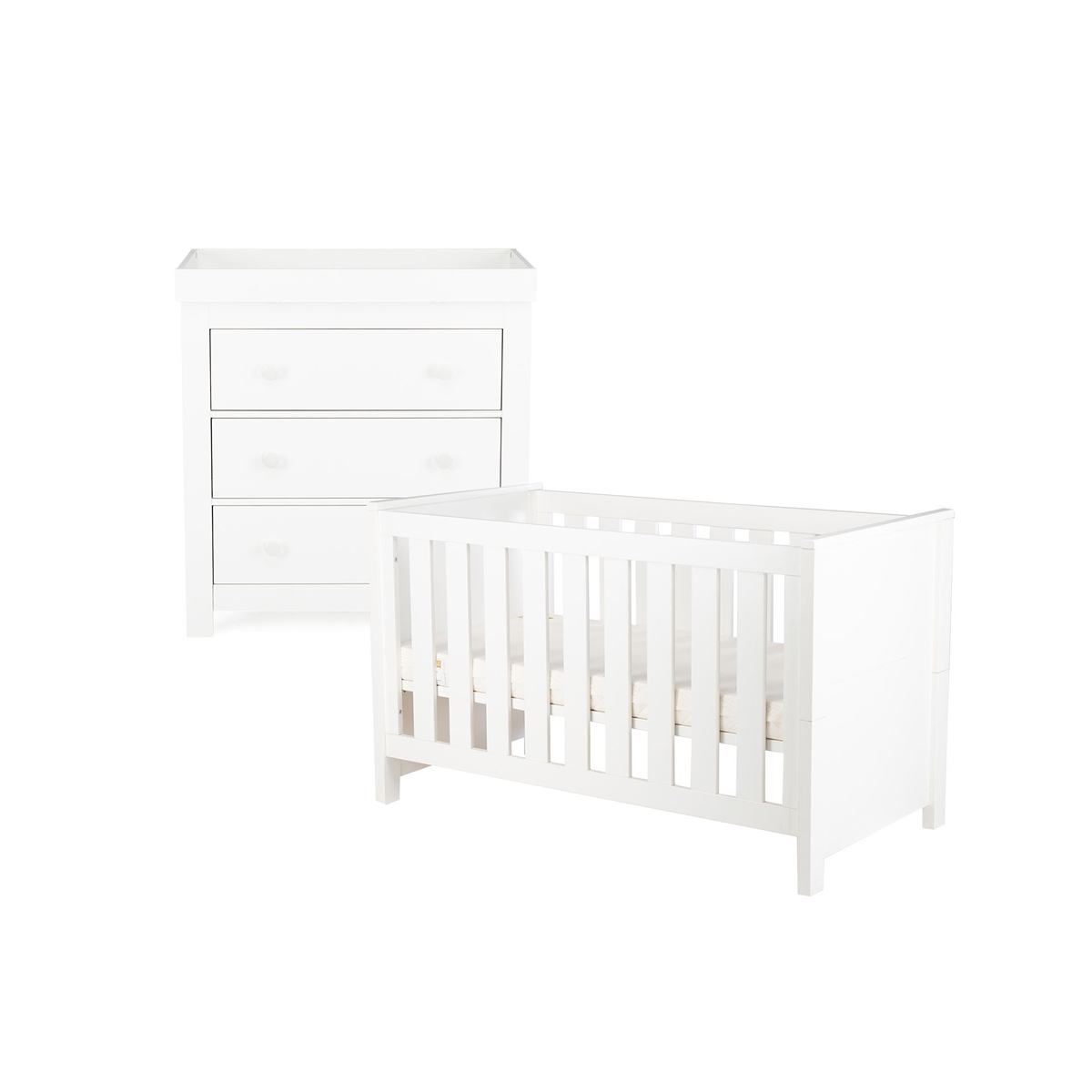 This Package includes: Aylesbury Dresser Aylesbury Cot Bed Aylesbury dresser Aylesbury 3 drawer dresser designed with silent soft close drawer runners so you don?t disturb your sleeping beauty, 3 spacious drawers to keep all your baby?s clothes and essentials organised, and aremovable changing station, contemporary modern styling to transform your nursery. Designed to care, designed to last Features: Maximum Storage Silent soft close drawers 3 Spacious drawers Removable changing station Can be used afterwards as a chest of drawers Wall Strap Kit for additional safety and stability Dimensions: 90 x 50 x 96cm Aylesbury Cot Bed Aylesbury full size cot bed suitable from birth to about 5 years. Designed with 3 mattresspositions to grow with your baby, the Aylesbury can easily transform into a day bed and a toddler bed to be used for years to come. Contemporary modern styling to transform your nursery. Features: Designed to care, designed to last Suitable from birth to approximately 5 years Modern contemporary design Solid ashwood top rails (optional on two tone only) Wide balustrades Three position mattress base Fixed side rails Can be turned into a day bed Converts into a stylish toddler bed Dimensions: 148 x 76 x 90cm