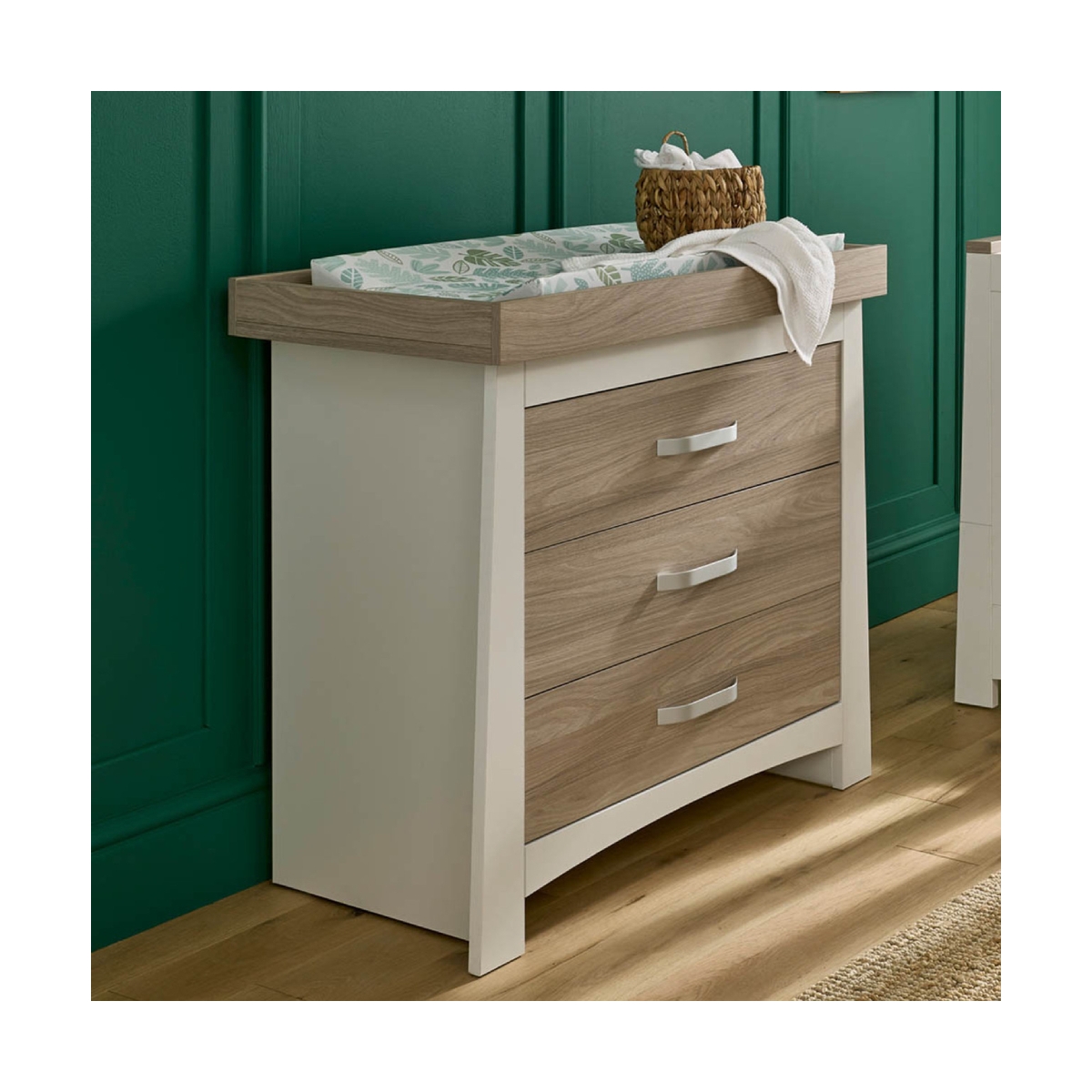 The Cuddle Co Ada Dresser is slick and stylish with gentle ash accents and has neutral shades, making it perfect for any nursery décor. This modern dresser features 3 spacious drawers with stunning brushed metal handles for storing your baby?s clothing and essentials. It comes with a detachable changing station on top that can easily be removed when no longer needed, to transform the changing unit into a handy dresser. Features: Slick and stylish with gentle ash accents Neutral shades – perfect for any nursery décor Practical 3 spacious drawers Changing top is suitable up to 11kg (12 months approx.) Detachable changing station on top Brushed metal handles Self-Assembly Required Materials: 93. 3% Chipboard, 6. 7% HDF Fully certified and accredited testing to BS EN 12221: 2008+A1: 2013, FIRA FRQG C001 & C004 Dimensions: Dresser with changing top Dimensions: L 85 x W 53. 2 x H 91. 2cm Dresser without changing top Dimensions: L 85 x W 50 x H 85cm Weight: 40. 5kg