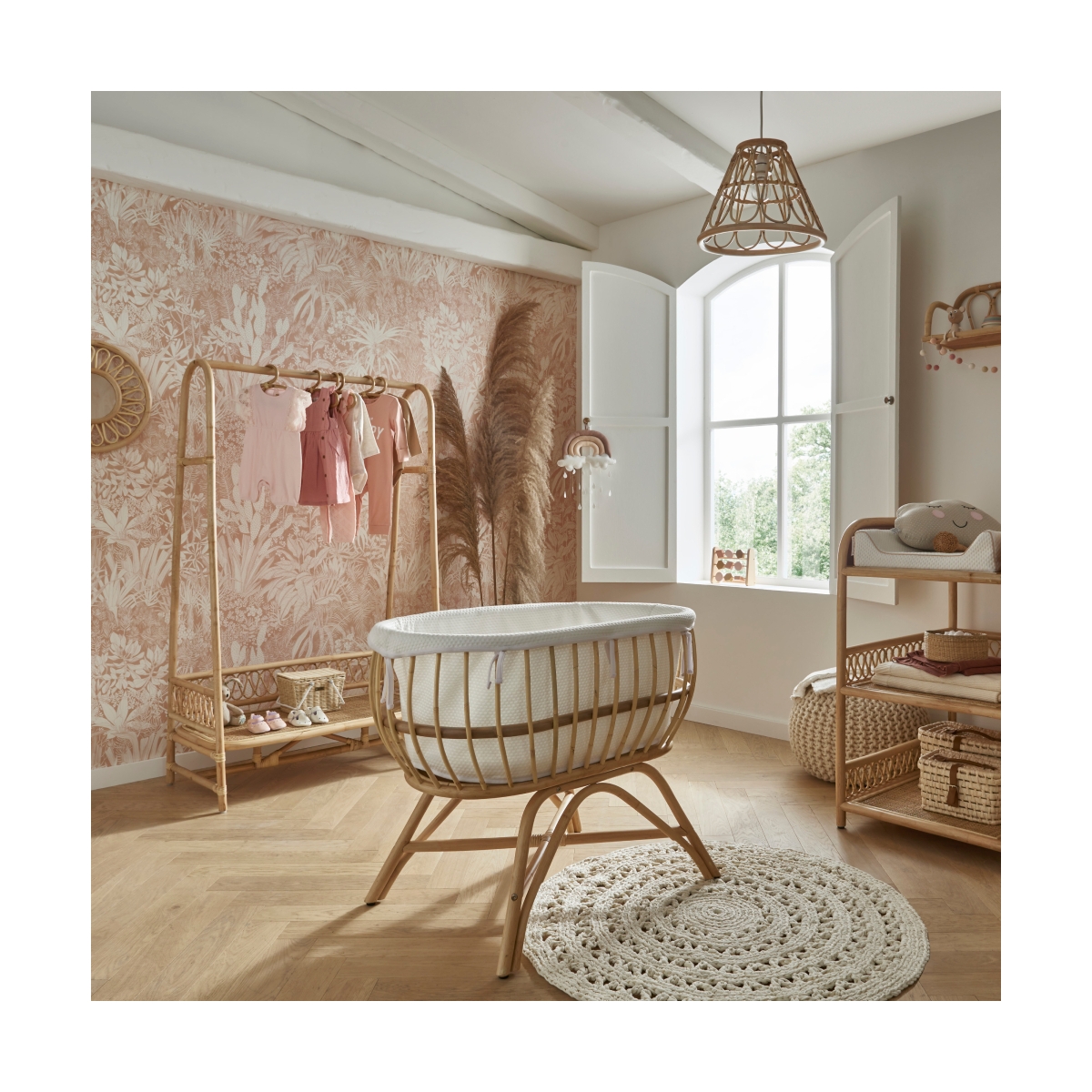 PACKAGE INCLUDES: Cuddle Co Aria Rattan Crib Cuddle Co Aria Rattan Changing Table Cuddle Co Aria Rattan Children’s Clothes Rail CUDDLECO ARIA RATTAN CRIB The Aria Crib promises to add warmth and texture to your nursery with its natural materials. Hand-made almost entirely of rattan, the newborn baby crib features an intricate design that will become the focal point of your nursery. Add a boho-chic feel to your baby?s bedroom with the Aria rattan nursery crib. Aria will look beautiful next to your bed or in the nursery. The Aria Crib comes with a foam mattress and a crib liner, containing anti-microbial properties to provide your baby with a clean, germ-free sleep environment. The mattress and liner feature a quilted fabric made with ultra-soft bamboo fibres, which help promote airflow and regulate temperature. The breathable mattress will support your baby as they sleep and grow. FEATURES: Suitabile from Crib 0-6 months Rattan crib has a modern yet natural design Stylish crib looks great with any room decor The Aria Crib comes with a liner and foam mattress included The liner must be used with the crib Lightweight so it is easy to move. Sturdy rattan crib with hard sidebars so baby is safe and snug The crib is not suitable for children who can sit or kneel or pull themselves up Materials: Rattan, Plywood DIMENSIONS: Dimensions: L92 x W56 x H73 cm CUDDLECO ARIA RATTAN CHANGING TABLE The Aria Rattan Changing Table brings warmth and texture to the nursery, along with a touch of boho-chic. Hand-made predominantly from rattan, this baby changing unit has a decorative design that makes the Aria rattan changer a stand-out piece of nursery furniture. The Aria Changer has an open design ideal for making smaller nurseries appear more spacious. This rattan changing table features a changing surface with raised sides, ensuring the changing mat stays safely in place while changing your baby?s nappy. Below the changing surface is 2 large shelves, perfect for holding all your nappy-c