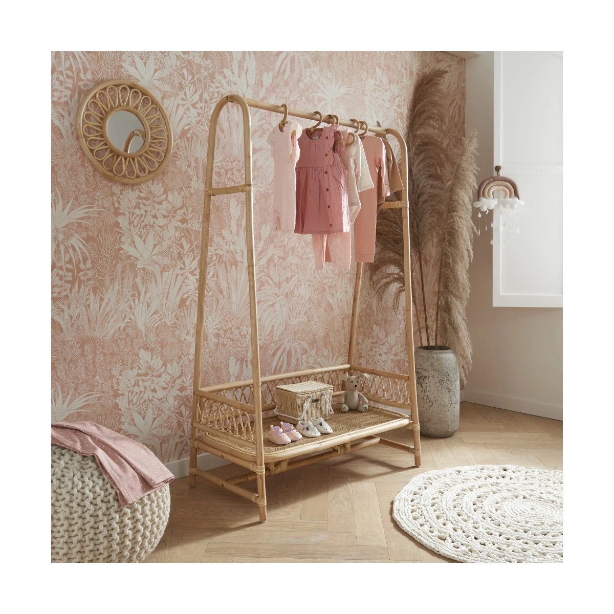 The Aria Clothes Rail is an easy way to incorporate a boho-chic feel into your nursery with its beautiful rattan design. This nursery clothing rail is predominantly made from rattan, a natural, sustainable material. This rattan baby clothes rail is perfect for adding warmth and texture to your little one?s bedroom. The Aria Clothes Rail is a stylish way to store your baby?s outfits, ready for their arrival. This nursery clothing rail is a modern alternative to a nursery wardrobe and a perfect option for smaller nurseries looking to create a more spacious nursery environment. Aria has plenty of room on its hanging rail for rompers, dungarees, coats and jackets. Plus, the dress-up rail even has a shelf for keeping your little one?s matching shoes. The Aria Clothes Rail comes with 3 matching, adorable Rattan Baby Clothes Hangers. Features: The Aria clothes rail has a rattan design and is the perfect way to add a boho-chic feel to your nursery Includes the Aria clothes rail and 3 hangers 1 storage shelf Features a large, spacious shelf for storing more clothes, shoes or accessories Self-assembly required Material: Rattan, Plywood Dimensions: Dimensions: L92 x W47 x H155 cm