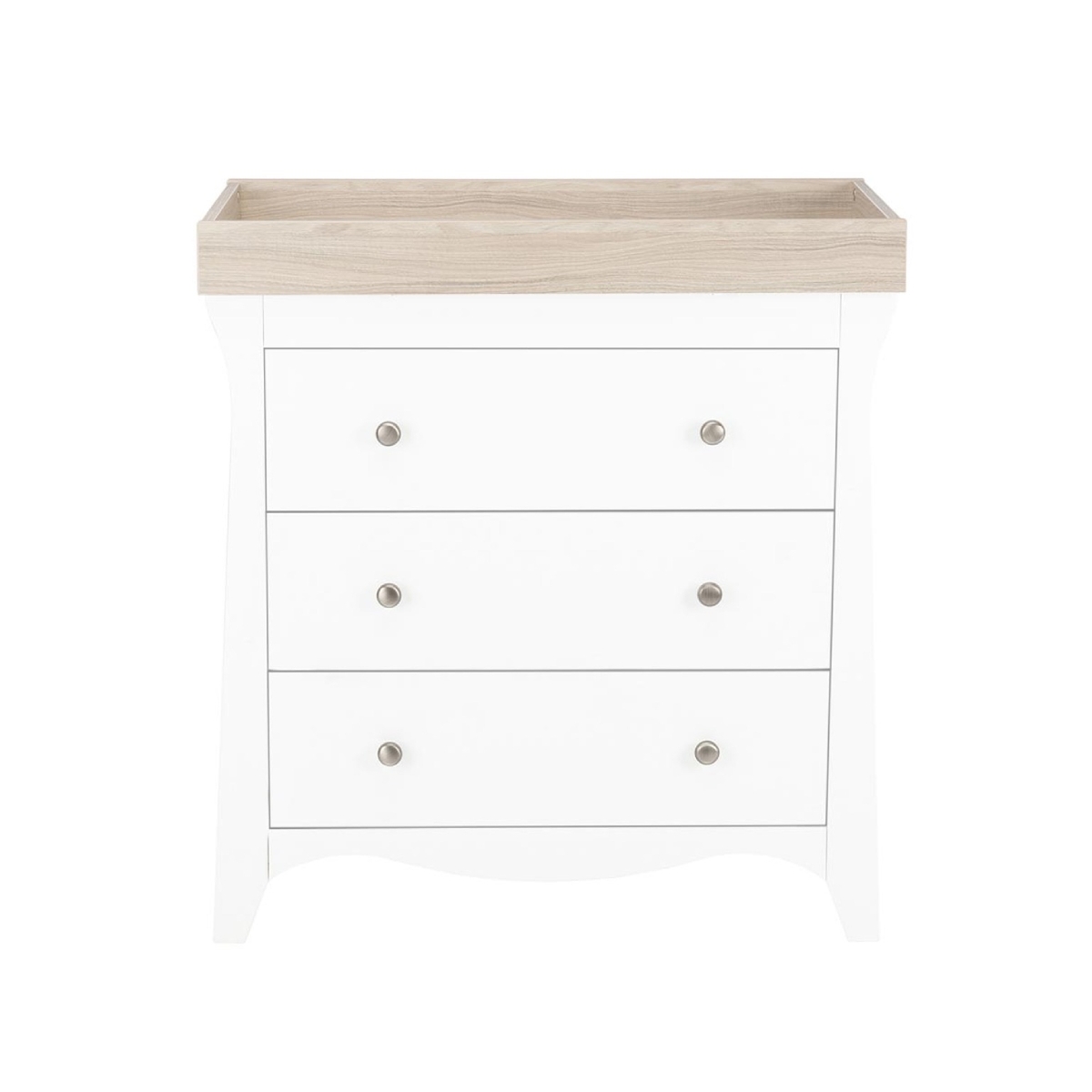 The Cuddle Co Clara Dresser is a piece of fashionable and practical furniture to complete your fairy tale nursery. This stylish dresser features 3 spacious drawers, which can be arranged to store your baby clothes and nappy changing essentials. Classic curved shapes and modern brushed metal handles add this dresser an extraordinary contrasting appearance. It comes with a solidly made detachable changing station on top and wall strap kit for additional stability and safety. This furniture is carefully designed in Great Britain and made of solid pine and manufactured wood. Features: Made of solid pine and manufactured wood Practical 3 spacious drawers Classic design with modern brushed metal handles Detachable changing station on top Incudes wall strap kit for additional stability and safety Self-Assembly Required Dimensions: Dimensions: H85 x W91 x D50 cm