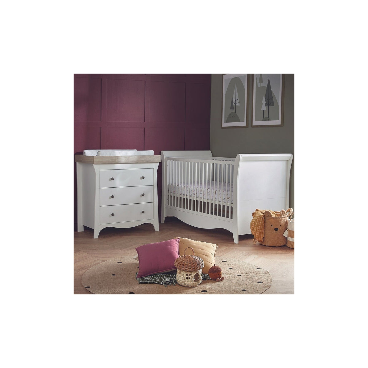 Package Includes: Cuddle Co Clara Sleigh Cot Bed Cuddle Co Clara 3 Drawer Dresser & Changer Cuddle Co Clara Sleigh Cot Bed The Clara Sleigh cot bed is part of our premium nursery furniture collection. The white sleigh design has curved sides and a curvy base rail along the length of the bed. Designed with 3 mattress base positions, it can be used from birth and lowered as your baby grows. The cot bed has a pre-split foot and headboard so you can easily convert it into a cute toddler bed, while keeping the curves of the sleigh design. Unique contemporary styling with subtle curved sleigh design will be an adorable addition to any modern nursery. Shop our Cot Bed Mattress collection. You’ll need one that is 140 x 70cm for this sleigh cot bed. Designed to care, designed to last. Self-assembly required. Features: Adorable curvaceous sleigh design 3 position mattress base for security as the child grows Easily converts to a toddler bed Hardwearing finish with non toxic finishes Requires a 140 x 70cm mattress Easy to convert into a cute toddler bed, while keeping curved sleigh aesthetic Dimensions: Cot Bed Size- 157 x 79 x 95cm (Lx Wx H) CUDDLECO CLARA 3 DRAWER DRESSER & CHANGER The Cuddle Co Clara Dresser is a piece of fashionable and practical furniture to complete your fairy tale nursery. This stylish dresser features 3 spacious drawers, which can be arranged to store your baby clothes and nappy changing essentials. Classic curved shapes and modern brushed metal handles add this dresser an extraordinary contrasting appearance. It comes with a solidly made detachable changing station on top and wall strap kit for additional stability and safety. This furniture is carefully designed in Great Britain and made of solid pine and manufactured wood. Features: Made of solid pine and manufactured wood Practical 3 spacious drawers Classic design with modern brushed metal handles Detachable changing station on top Incudes wall strap kit for additional stability and safety Self-Assembly