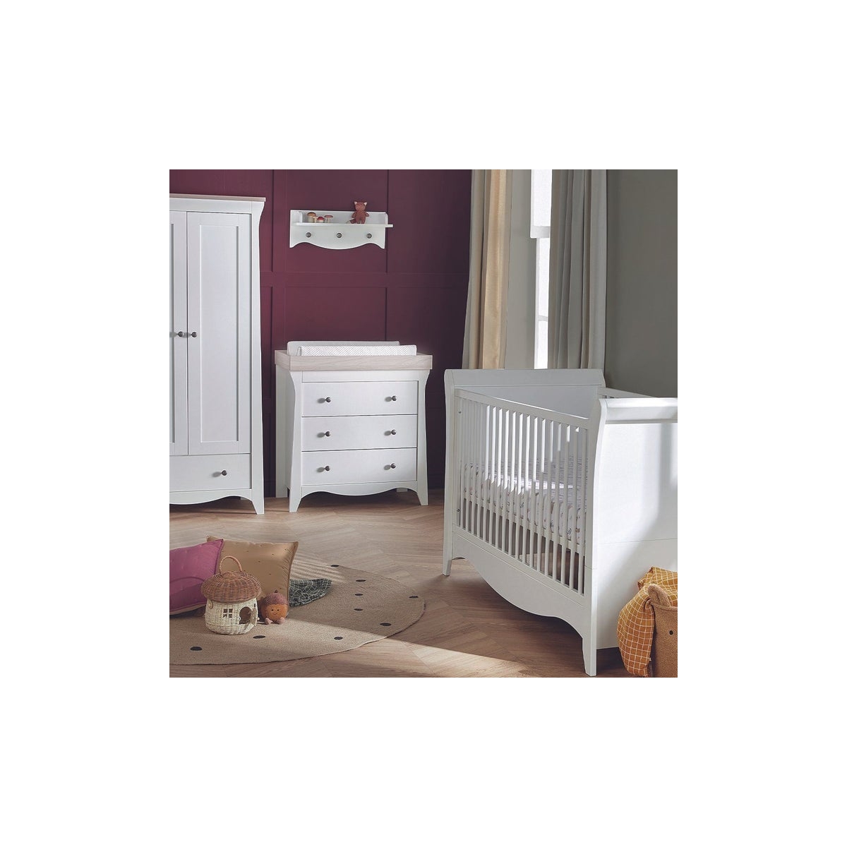 PACKAGE INCLUDES: Cuddle Co Clara Sleigh Cot Bed Cuddle Co Clara 3 Drawer Dresser & Changer Cuddle Co Clara Double Door Wardrobe CUDDLECO CLARA SLEIGH COT BED The Clara Sleigh cot bed is part of our premium nursery furniture collection. The white sleigh design has curved sides and a curvy base rail along the length of the bed. Designed with 3 mattress base positions, it can be used from birth and lowered as your baby grows. The cot bed has a pre-split foot and headboard so you can easily convert it into a cute toddler bed, while keeping the curves of the sleigh design. Unique contemporary styling with subtle curved sleigh design will be an adorable addition to any modern nursery. Shop our Cot Bed Mattress collection. You’ll need one that is 140 x 70cm for this sleigh cot bed. Designed to care, designed to last. Self-assembly required. Features: Adorable curvaceous sleigh design 3 position mattress base for security as the child grows Easily converts to a toddler bed Hardwearing finish with non toxic finishes Requires a 140 x 70cm mattress Easy to convert into a cute toddler bed, while keeping curved sleigh aesthetic Dimensions: Cot Bed Size- 157 x 79 x 95cm (Lx Wx H) CUDDLECO CLARA 3 DRAWER DRESSER & CHANGER The Cuddle Co Clara Dresser is a piece of fashionable and practical furniture to complete your fairy tale nursery. This stylish dresser features 3 spacious drawers, which can be arranged to store your baby clothes and nappy changing essentials. Classic curved shapes and modern brushed metal handles add this dresser an extraordinary contrasting appearance. It comes with a solidly made detachable changing station on top and wall strap kit for additional stability and safety. This furniture is carefully designed in Great Britain and made of solid pine and manufactured wood. Features: Made of solid pine and manufactured wood Practical 3 spacious drawers Classic design with modern brushed metal handles Detachable changing station on top Incudes wall strap kit for additiona