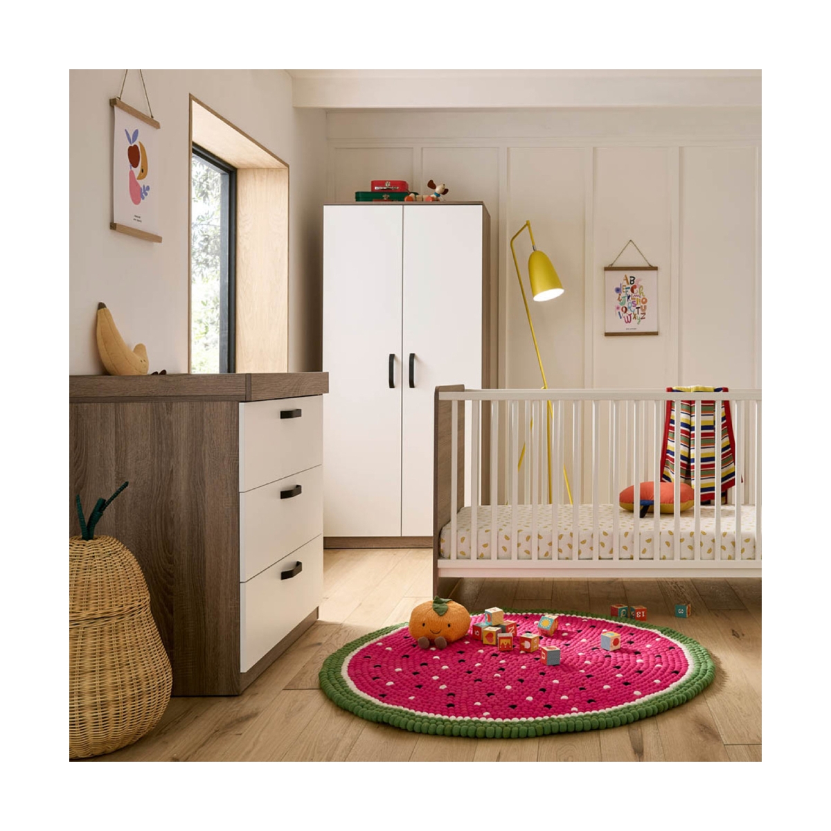 PACKAGE INCLUDES: Cuddle Co Enzo Cot Bed Cuddle Co Enzo 3 Drawer Dresser & Changer Cuddle Co Enzo Wardrobe CUDDLECO ENZO COT BED The Cuddle Co Enzo Cot Bed is simply designed with natural shades, finished in a beautiful wood with calming accents. Suitable from birth to 5 years old, this cot bed offers 3 different mattress base positions to easily and comfortably get your little one in and out as they grow. Once your child is around 18 months old, you can effortlessly convert the cot into a toddler bed. FEATURES: Suitable from birth up to 5 years old Simply designed with natural shades Subtle design with beautiful wood finish and calming accents Convenient 3 mattress base positions Easily converts into a toddler bed for use by one child from 18 months to 5 years Self-Assembly Required Requires 140 x 70 cm mattress (not included) Materials: Pine 54. 26% MFC 45. 74% Fully certified and accredited testing to BS EN 716: 2017, BS 8509: 2008+A1: 2011 DIMENSIONS: Cot Bed Dimensions: L 146. 6 x W 76. 6 x H 90 cm When converted into a Toddler Bed Dimensions: L 146. 6 x W 76. 6 x H 45. 2cm Height of base positions down (from top edge of side): Highest 34cm, Middle 46cm, Lowest 65cm Weight: 23. 8kg CUDDLECO ENZO 3 DRAWER DRESSER & CHANGER The Cuddle Co Enzo Dresser is simply designed with natural shades, finished in a beautiful wood with calming accents. This gorgeous dresser features 3 spacious drawers with slim black painted metal handles for storing your baby?s clothing and essentials. It comes with a detachable changing station on top that can easily be removed when no longer needed, to transform the changing unit into a handy dresser. FEATURES: Simply designed with natural shades Subtle design with beautiful wood finish and calming accents Practical 3 spacious drawers Changing top is suitable up to 11kg (12 months approx.) Detachable changing station on top Slim metal handles with black painted finish Self-Assembly Required Materials: 100% Manufactured board Fully certified and accredite