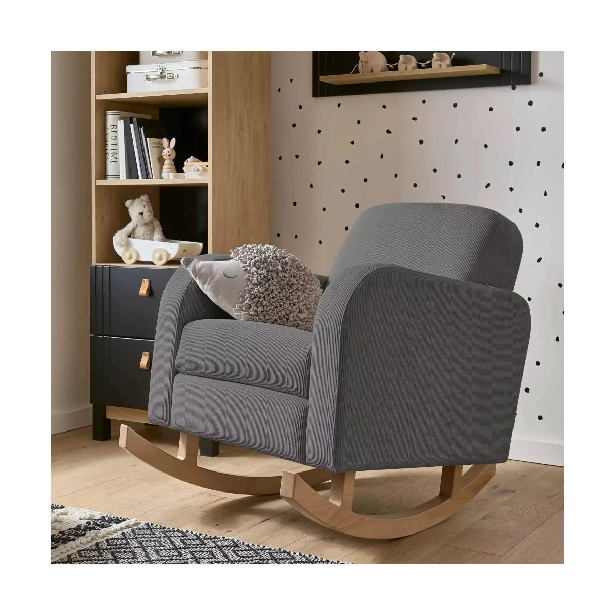The Etta Nursing Chair in Anthracite will be a welcome addition to your nursery space. This dark grey nursing chair has a contemporary design with a classic rocking chair twist. Its soft curves and cord detailing are sure to add comfort and style to the nursery. Etta is guaranteed to offer comfort and support while you nurse your baby. Its super-soft padded seat and back will make those midnight feeds a breeze. This rocking nursing chair will be cherished for years to come as you bond with your little one over nursery books and lullabies. Features: Soft and comfortable rocking nursing chair Provides a soothing rocking motion The perfect spot for nursing and bonding with your baby Dimensions: Dimensions: 90 x 70 x 86cm (L x W x H)