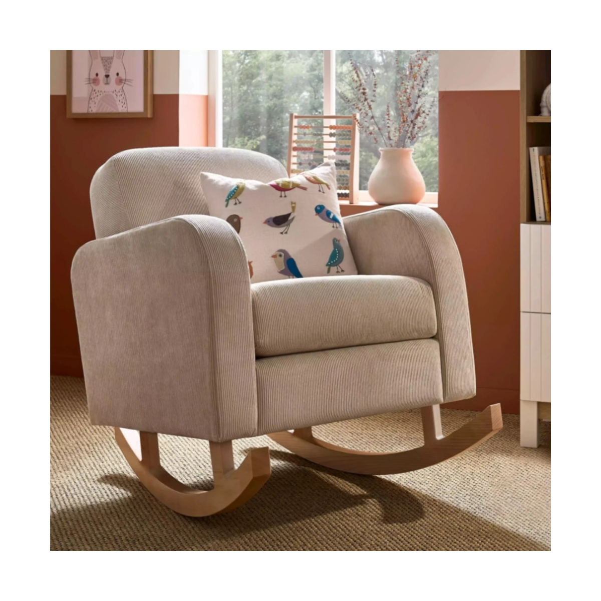 The Etta Nursing Chair in Coral will add a touch of colour to your baby?s bedroom. Its contemporary design combines soft curves with cord detailing to create a charming staple for the nursery. The Etta Nursing Chair not only offers a stylish accent piece for the nursery but also provides the comfort you need while nursing your little one. Welcoming, soft and deeply padded. This pink nursing chair will be your new favourite spot to sit and bond with your baby. Features: Soft and comfortable rocking nursing chair Provides a soothing rocking motion The perfect spot for nursing and bonding with your baby Dimensions: Dimensions: 90 x 70 x 86cm (L x W x H)