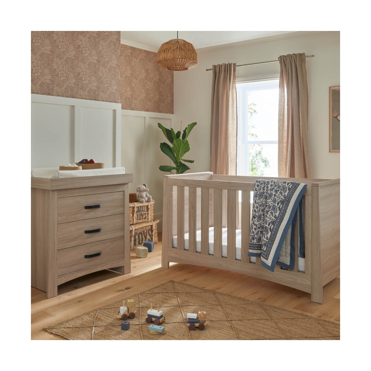 Package Includes: Cuddle Co Isla Cot Bed Cuddle Co Isla 3 Drawer Dresser & Changer Cuddle Co Isla Cot Bed The Cuddle Co Isla Cot Bed combines contemporary with classic styling, boasting a bold, clean design with gentle ash tones. Suitable from birth to 5 years old, this cot bed offers 3 different mattress base positions to easily and comfortably get your little one in and out as they grow. Once your child is around 18 months old, you can effortlessly convert the cot into a toddler bed. FEATURES: Suitable from birth up to 5 years old Combination of contemporary with classic Bold, clean design with gentle ash tones Convenient 3 mattress base positions Easily converts into a toddler bed for use by one child from 18 months to 5 years Self-Assembly Required Requires 140 x 70 cm mattress (not included) Materials: 83. 3% Chipboard, 2. 5% HDF, 14. 2% Pine Fully certified and accredited testing to BS EN 716: 2017, BS 8509: 2008+A1: 2011 DIMENSIONS: Cot Bed Dimensions: L 156 x W 74. 4 x H 88cm When converted into a Toddler Bed Dimensions: L 156 x W 74. 4 x H 53. 6cm Height of base positions down (from top edge of side): Highest 33cm, Middle 53cm, Lowest 65cm Weight: 47. 6kg Cuddle Co Isla 3 Drawer Dresser & Changer The Cuddle Co Isla Dresser combines contemporary with classic styling, boasting a bold, clean design with gentle ash tones. This practical dresser features 3 spacious drawers with beautiful, black metal handles for storing your baby?s clothing and essentials. It comes with a detachable changing station on top that can easily be removed when no longer needed, to transform the changing unit into a handy dresser. FEATURES: Combination of contemporary with classic Bold, clean design with gentle ash tones Practical 3 spacious drawers Detachable changing station on top Changing top is suitable up to 11kg (12 months approx.) Beautiful black metal handles Self-Assembly Required Materials: 93. 3% Chipboard, 6. 7% HDF Fully certified and accredited testing to BS EN 12221: 2008+A1: 2013, FIRA