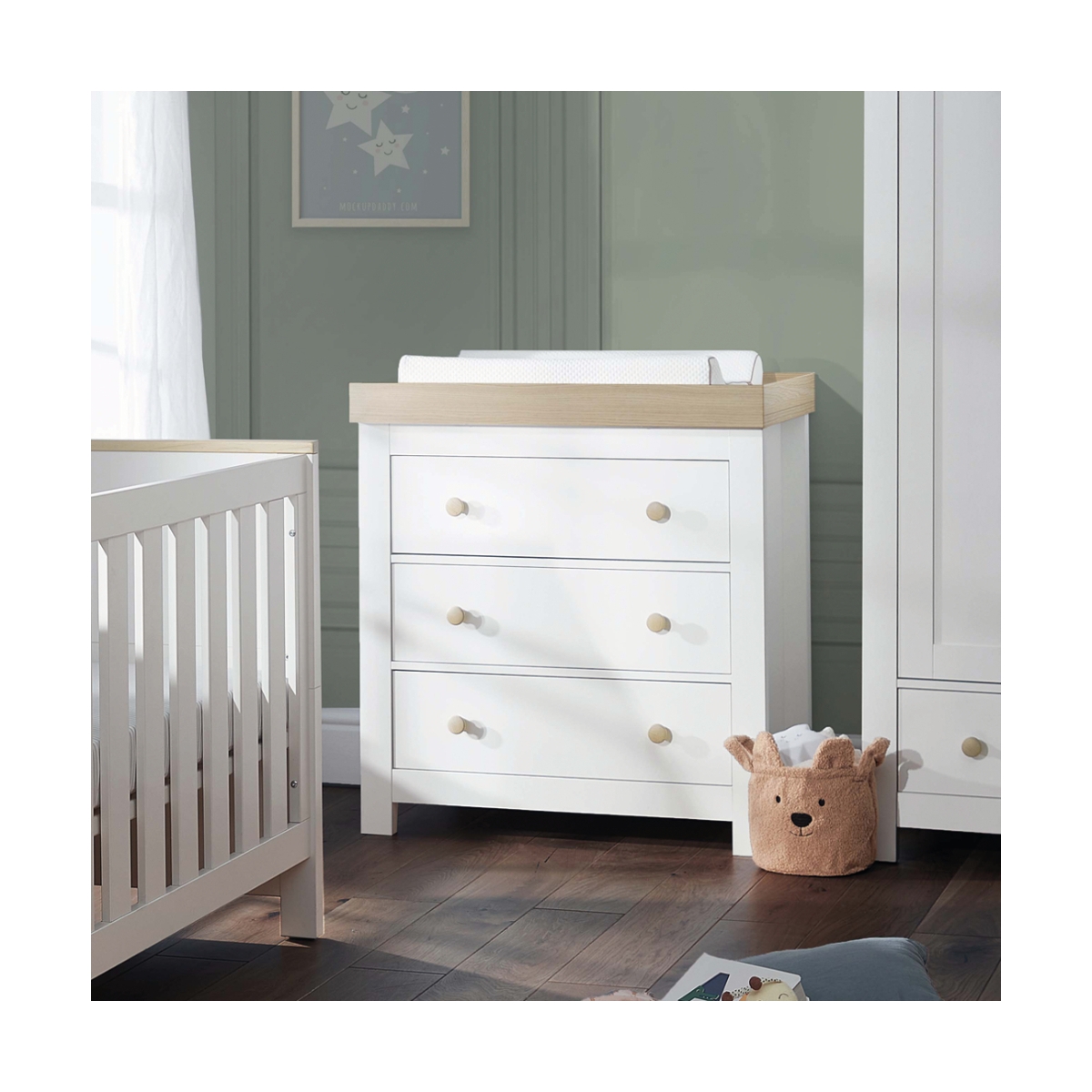 Subtle traditional features of the nursery dresser design makes it the perfect choice for your nursery. Oak effect accents and handles add a warm touch to the cool white dresser. The Luna 3 drawer dresser and changer is designed with 3 spacious drawers to keep all your baby’s clothes and essentials organised. It also features a removable changing top to convert the baby changing station into a stylish set of drawers to see your baby into childhood. Designed to care, designed to last. Designed to care, designed to last. Self-assembly required. Features: Made of solid pine and manufactured wood Practical 3 spacious drawers Modern cube-shaped design with contrasting oval handles Detachable changing station on top Incudes wall strap kit for additional stability and safety Self-Assembly Required Dimensions: Dimensions: H90 x W96 x D50 cm