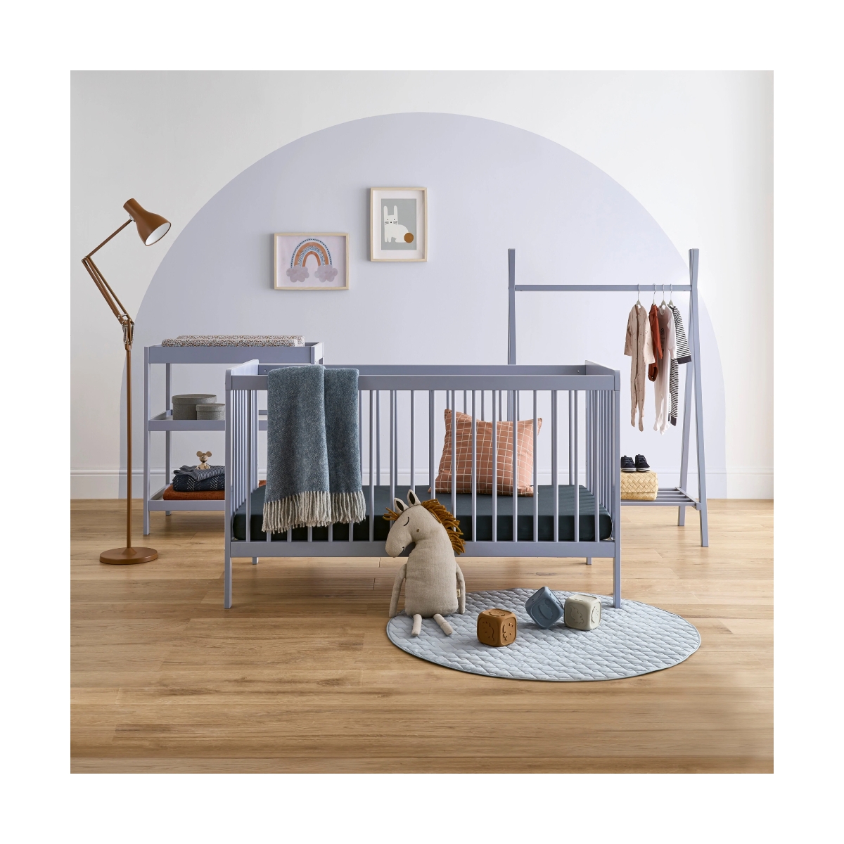 PACKAGE INCLUDES: Cuddle Co Nola Cotbed Cuddle Co Nola Changer Cuddle Co Nola Cloth Hanger Rail CUDDLECO NOLA COTBED The Nola Cot Bed is an easy way to introduce colour to your little one?s room. Nola?s baby-safe paint finish is a calming colour perfect for creating a relaxing nursery environment. The playful use of colour and minimal design makes this cot bed a must-have for the contemporary nursery. Made with 100% sustainably sourced pine wood, this cot bed is a nursery must-have. The Nola Cot Bed will accompany your little one from birth until their 5. The cot bed has 3 mattress base positions, allowing you to adjust the height of the mattress to suit your growing baby. Eventually, your baby will outgrow the cot mode, but not to worry, as Nola effortlessly converts to a toddler bed when your little one is ready. FEATURES: Suitable for 0-5 years 3 different mattress base positions Converts from cot bed to a day bed When converted into a day bed this product is recommended for use by one child aged 18 months to 5 years Requires a 140 x 70cm cot bed mattress sold separately Fully certified and accredited testing to BS EN 716: 2017+AC: 2019, BS 8509: 2008+A1: 2011 All our paint is Nitro based that is tested to EN 71-3: Migration of certain elements. It is not water based. This means the paint we use is baby-safe. DIMENSIONS: Product dimensions: L144 x W74. 9 x H87 cm CUDDLECO NOLA CHANGER The Nola Changer is a simple way to add a pop of colour to your nursery. The changing unit has a simple, contemporary design complimented beautifully, baby-safe paint finish. The Nola baby changing table, made with sustainably sourced pine wood, is the perfect fit for the modern nursery. The Nola changing unit has a changing surface for you to place your little one?s changing mat. The raised sides will keep the mat securely in place while you change your baby?s nappy. Day-to-day changing essentials can be kept nearby on one of the 2 spacious shelves below the changing top, making the baby c