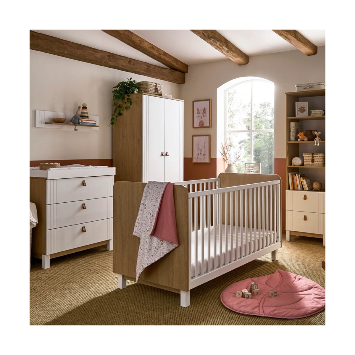 PACKAGE INCLUDES: Cuddle Co Rafi Cot Bed Cuddle Co Rafi 3 Drawer Dresser & Changer Cuddle Co Rafi Wardrobe Cuddle Co Rafi Bookcase Cuddle Co Rafi Shelf CUDDLECO RAFI COT BED The Cuddle Co Rafi Cot Bed has been designed especially for the contemporary nursery, boasting two-tone styling with natural oak and a stylish, painted finish. Suitable from birth to 5 years old, this modern cot bed offers 3 different mattress base positions to easily and comfortably get your little one in and out as they grow. Once your child is around 18 months old, you can effortlessly convert the cot into a day bed. FEATURES: Suitable from birth up to 5 years old Two-tone styling – natural oak with stylish, painted finish Striking design to complement contemporary nursery Convenient 3 mattress base positions Easily converts into a day bed for use by one child from 18 months to 5 years Self-Assembly Required Materials: 39% chipboard, 6% MDF, 53% beech wood, 2% beech wood Fully certified and accredited testing to BS EN 716: 2017, BS 8509: 2008+A1: 2011 Requires 140 x 70 cm mattress (not included) DIMENSIONS: Dimensions: L 144 x W 76 x H 85cm Height of base positions down (from top edge of side): Highest 34cm, Middle 50cm, Lowest 62cm Weight: 32. 5kg CUDDLECO RAFI 3 Drawer Dresser & Changer The Cuddle Co Rafi Dresser has been designed especially for the contemporary nursery, boasting two-tone styling with natural oak and a stylish, painted finish. This practical dresser features 3 drawers with soft, real leather handles for storing your baby?s clothing and essentials, that are also soft closing to provide a peaceful nursery. It comes with a detachable changing station on top that can easily be removed when no longer needed to transform the changing unit into a handy dresser. FEATURES: Two-tone styling – natural oak with stylish, painted finish Striking design to complement contemporary nursery Practical 3 soft closing drawers Changing top is suitable up to 11kg (12 months approx.) Detachable changing stat