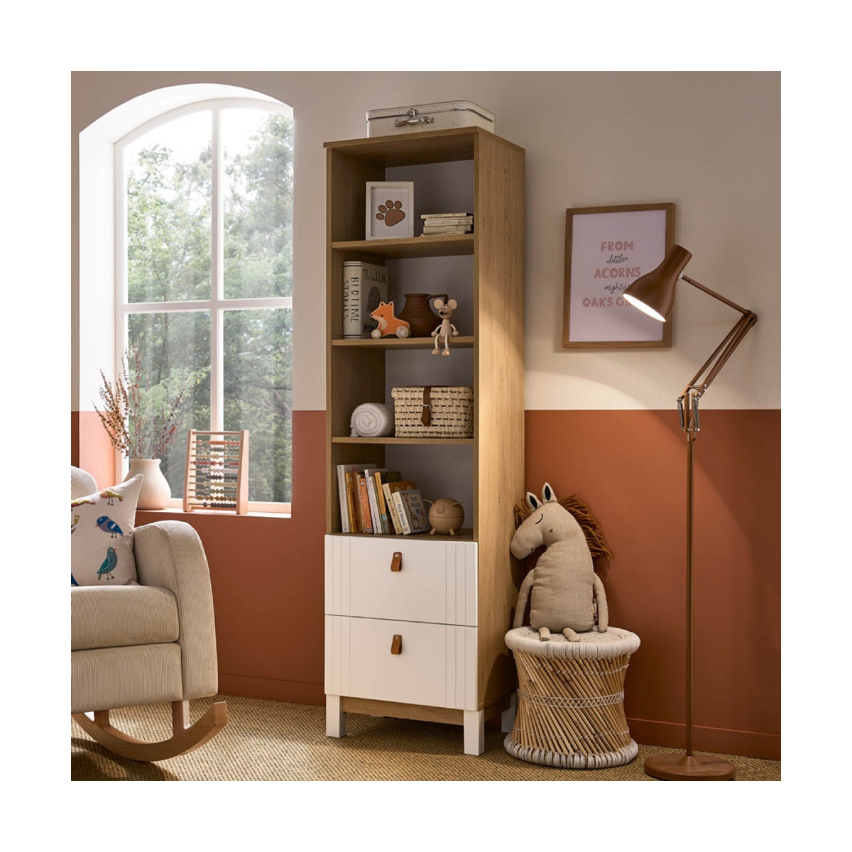 The Cuddle Co Rafi Bookcase has been designed especially for the contemporary nursery, boasting two-tone styling with natural oak and a stylish, painted finish. Ideal for adding storage space to your nursery, it features 4 roomy shelves for popping your little one?s books and 2 spacious drawers that are soft close. Features: Two-tone styling – natural oak with stylish, painted finish Striking design to complement contemporary nursery 4 roomy shelves 2 soft close drawers Self-Assembly Required Materials: 81% chipboard, 9% MDF, 8% HDF, 2% beech wood Fully certified and accredited testing to FIRA FRQG C001 & C004 Dimensions: Dimensions: L 37 x W 50 x H 180 cm Weight: 39kg
