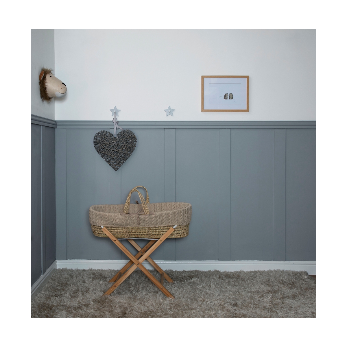Elegant knitted natural palm moses basket, to create a natural sleeping environment for your little one and easy to pick up and move around your house. Features: Suitable from birth or when baby can sit up unaided Good Quality Palm leaf basket Includes Quilted Moses basket mattress Natural folding stand Stunning knitted Linner Maximum child weight-9kg Includes Knitted Basket Linner and mattress The knitted liner is mega soft and breathable, it is constructed of 50% cotton and 50% acrylic, to ensure your little one is cosy and snug Washable 30 degrees