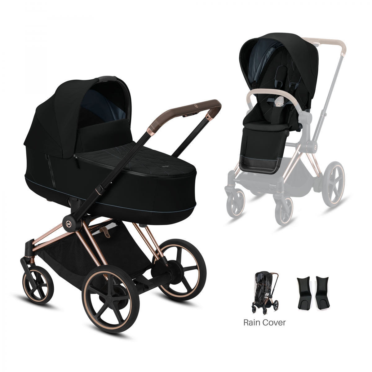 This Package Includes: Cybex e-Priam Stroller Cybex Lux Carrycot Cybex e-Priam Rose Gold Chassis All Terrain 2in1 Pram System The 2020 Cybex e-Priam Pushchair offers a one hand fold, height adjustable handlebar, light frame, bumper bar, all wheel suspension and more. This is a stylish and practical pushchair, it includes features that parents will adore and a smooth and comfy ride for your little one. Features: Foot brake Padded harness All terrain wheels Two wheel mode One hand folding One hand recline From swivel wheels Seat at table height Reversible seat unit All wheel suspension Light aluminium frame Height adjustable handlebar 4 in 1 travel system options Flat ergonomic lying position Handlebar is made from a leather look material Memory buttons – seat can be clicked on an off easily Extendable XXL sun canopy with UPF50+ and mesh insert for air circulation Bumper bar is made from a leather look material – can be opened at either side and rotated Dimensions: Chassis weight: 12. 6kg Extra large shopping basket – takes up to 5kg Use from birth to 17kgs (approx 4 years) Extra large shopping basket – takes up to 5kg Measurements when folded: L950 x W600 x H400mm Cybex Lux Carrycot The Cybex e-Priam Carrycot Lux easily attaches onto the Cybex e-Priam chassis – perfect for sophisticated and comfortable familytravelling. The spacious unit boasts generous dimensions and maximum comfort for baby. Features: Use from birth to 9kgs (approx 6 months) Integrated carry handle in the sun canopy Sun canopy with UPF50+ sun protection Dimensions: Weight: 4.9kg