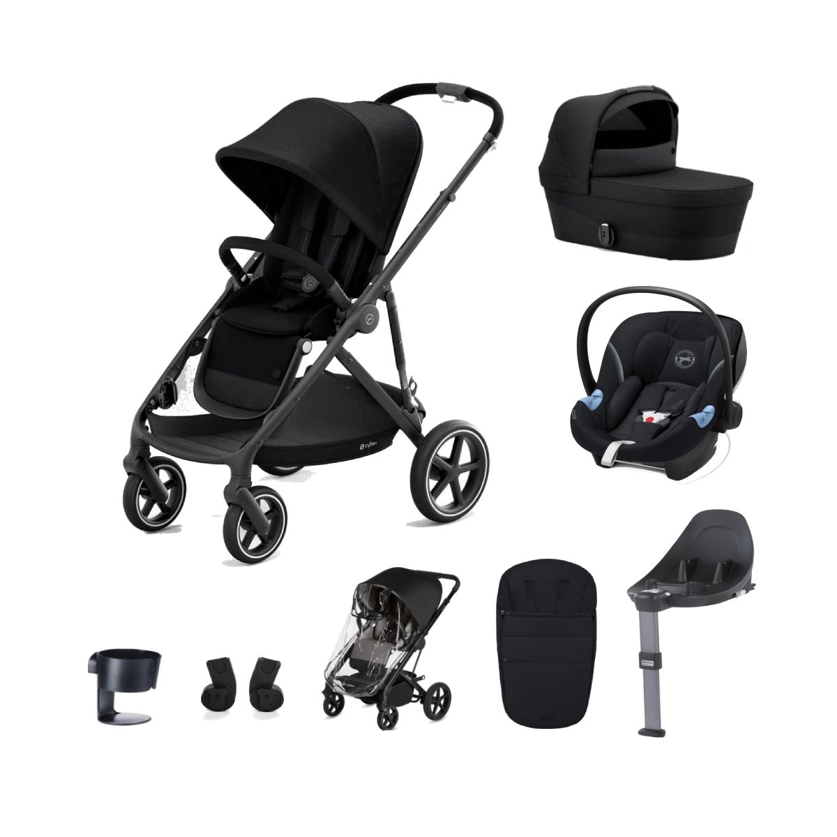PACKAGE INCLUDES: Cybex Gazelle S Pushchair Cybex Gazelle S Cot Cybex Aton M i-Size Group 0+ Car Seat Cybex Base M-Black Cybex Gazelle S Car Seat Adaptors Cybex Raincover Cybex Footmuff Cybex Cup Holder CYBEX GAZELLE S PUSHCHAIR The Cybex Gazelle S Pushchair features a detachable shopping basket as-well as a huge stroller basket under the seat. This is the ideal companion whether you?re visiting the weekly market or browsing stores in the city center. The stroller also grows with your family, supporting over 20 configurations of seat units, cots or any CYBEX infant car seats. Ready from birth, the stroller seat?s ergonomic lie-flat position makes the Gazelle S the ideal choice from the very beginning of your family?s journey. FEATURES: Compact fold Use from birth to 4 years (approx) Sun canopy features a mesh panel Two shopping baskets XXL UPF50+ sun canopy Ergonomic lie flat position The Gazelle S grows with your family, offering endless opportunities to attach different combinations of stroller seats, cots or CYBEX infant car seats DIMENSIONS: Weight: 12. 6kg With a combined basket capacity of 23 kg Folded measurements: H86 x D35 x W65cm Measurements: L930-1060 x W650 x H1000-1100mm Max Weight: 22kg in single mode + 2 x 22kg in duo mode CYBEX GAZELLE S COT The Cybex Gazelle S Cot in Deep Black is perfect for your newborn baby, it’s the perfect bed on the go. The Gazelle S Cot is equipped with a soft and comfortable foam mattress supporting a correct lying position for your little one, while a canopy with an inserted mesh window offers shelter and UPF50+ protection from the sun?s rays. The carry handle of the Gazelle S Cot is placed along the sun canopy for easy carrying and attaching to a Pushchair frame. With an interior lining fabric that?s as warm and comfortable as cotton, our biggest CYBEX Gazelle S Cot is not only super-spacious but also offers a comfortable, sheltered place. No additional adapters are needed for the Gazelle S Cot, simply place the cot on the